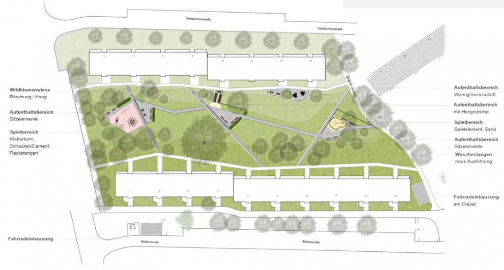 Es werden somit direkte und barrierearme Verbindung geschaffen, die es den Bewohnern ermöglichen den neu definierten Raum gemeinsam zu nutzen. Eine Abfolge von Spiel- und Aktionsflächen, beschatteten Aufenthalts- und Kommunikationsbereichen und frei erschließbaren Wiesenbereichen ermöglicht eine starke Interaktion der Bewohner.
