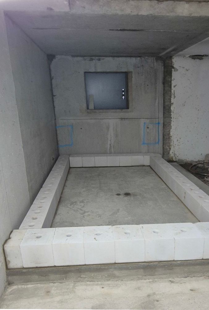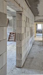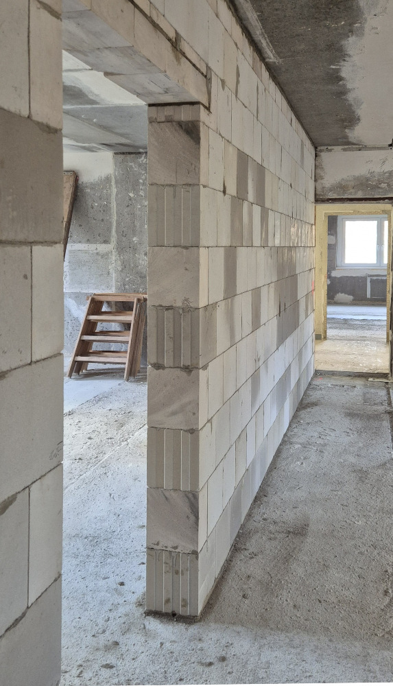 Nun werden im Gebäudeinneren neue Aufzugsschächte und Wohnungstrennwände gemauert, die dann die Grundlage für die neuen Wohnungsgrundrisse sind.