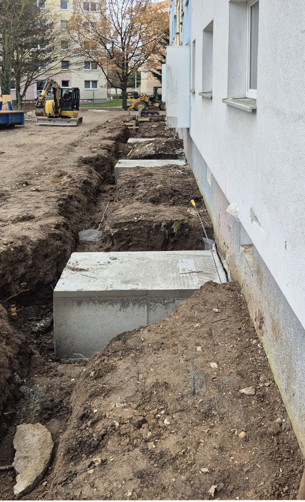 An der Fassade wurden die Bestandsbalkone zurückgebaut und derzeit werden die Fundamente für die neuen Balkonanlagen hergestellt.