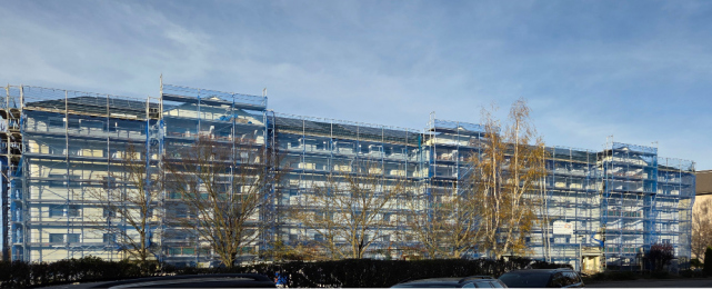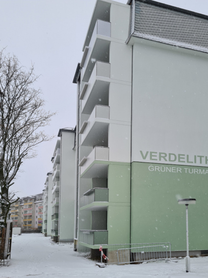 Die Arbeiten am Mehrfamilienhaus in der Paul-Müller-Straße 35-45 befinden sich in den letzten Zügen – und das im wahrsten Sinne des Wortes. Nachdem im Februar noch einmal richtig Gas gegeben wurde, konnten die Balkonbrüstungen termingerecht montiert werden. Damit zeigt sich die Fassade nun in ihrem finalen Erscheinungsbild und rundet das Gesamtbild des Gebäudes harmonisch ab.