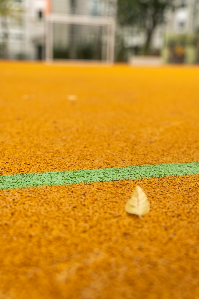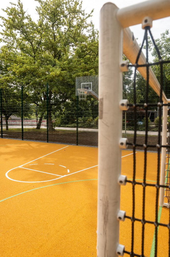 Ein besonderes Highlight stellt der neue, wasserdurchlässige EPDM-Sportbelag dar. Auf einer Fläche von über 350 m² bietet er mit seiner gold-gelben Farbgebung nicht nur ideale Spielbedingungen, sondern prägt auch das ästhetische Erscheinungsbild des gesamten Platzes maßgeblich.