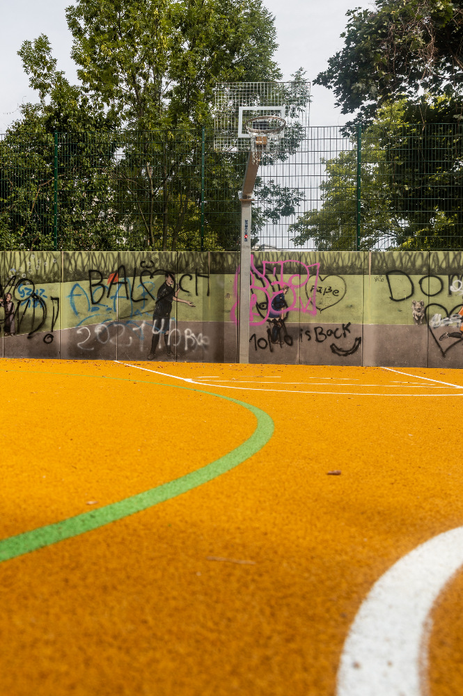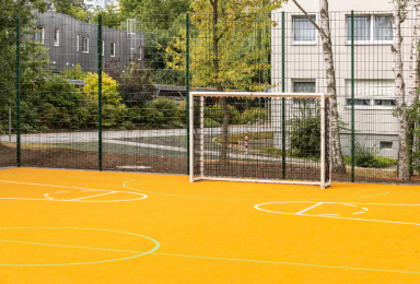Der Ballfangzaun erhielt eine komplette Erneuerung mit einem besonderen Augenmerk auf Schallschutz: Durch seine spezielle Konstruktion werden Ballanschlaggeräusche deutlich reduziert – ein spürbarer Mehrwert für das gesamte Wohnumfeld.