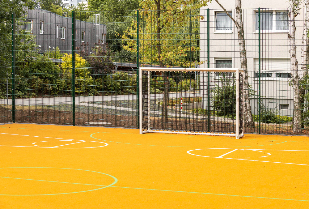 In Verbindung mit dem glänzenden Ballfangzaun entsteht so ein harmonisches Gesamtbild – modern und funktional. Der Bolzplatz präsentiert sich nun als echtes Schmuckstück des Quartiers – ein Ort der Bewegung und Begegnung.