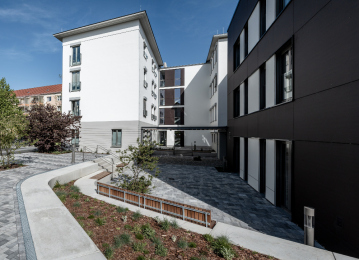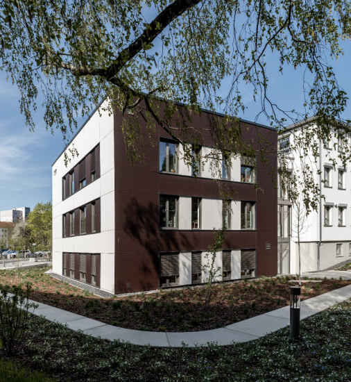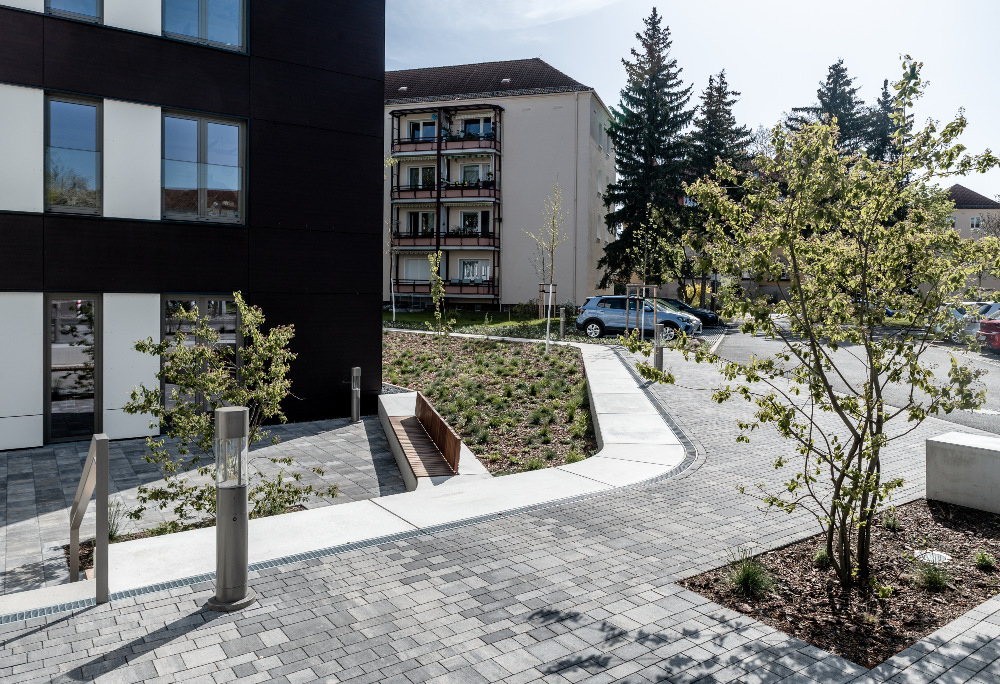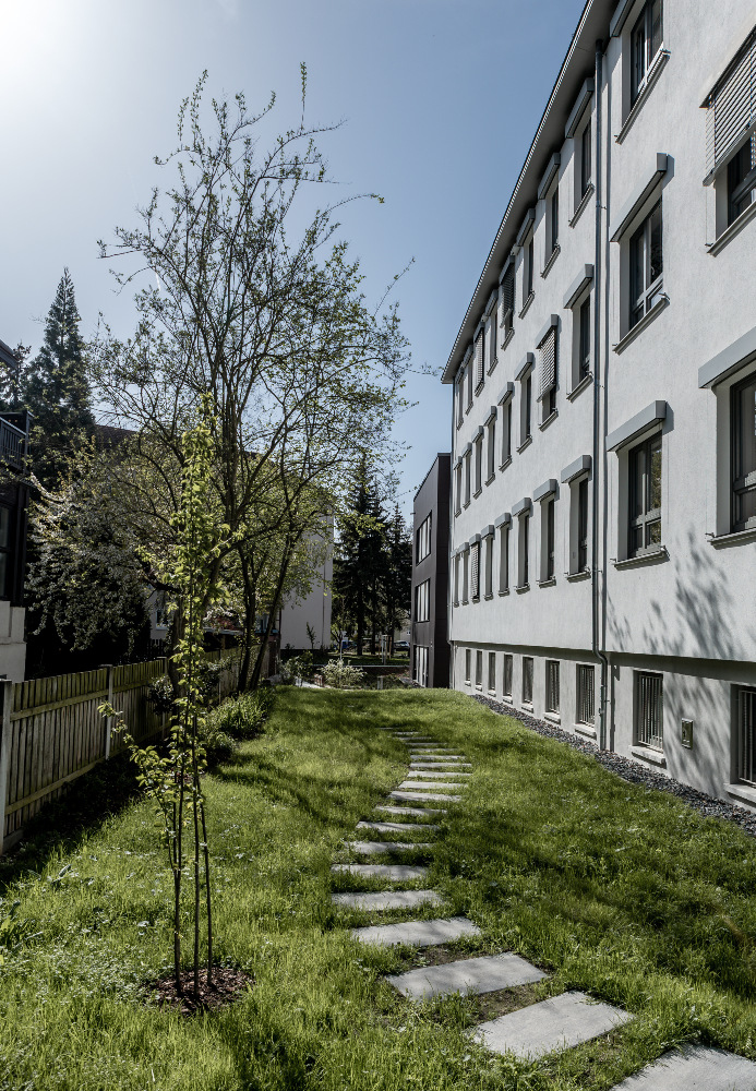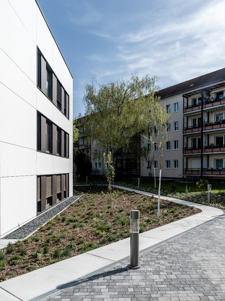 Im Zuge der umfassenden Sanierung des Bürogebäudes der WG Aufbau und der Errichtung eines modernen Anbaus erfuhren auch die Außenanlagen eine grundlegende Transformation.