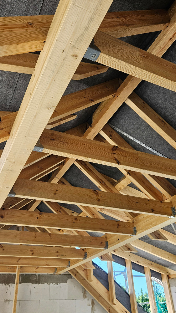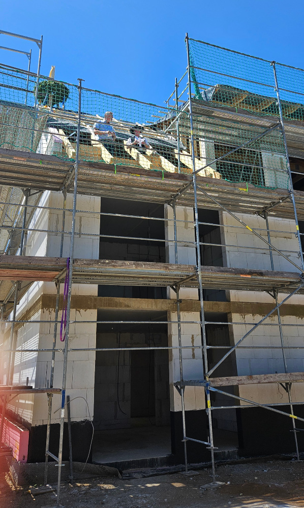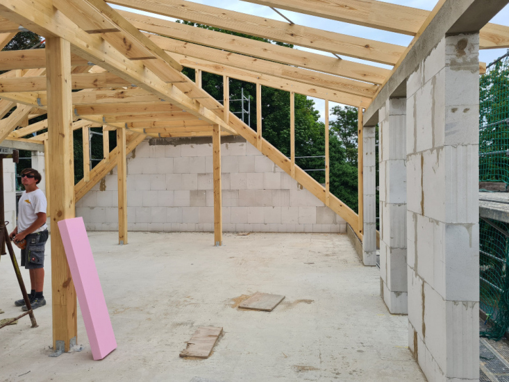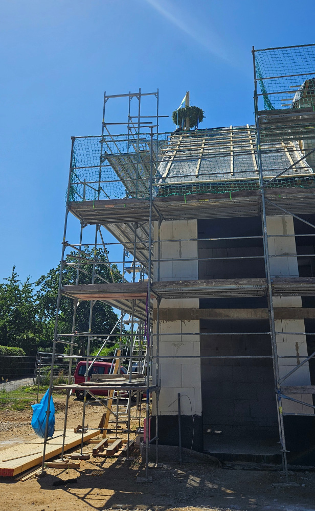 Unser Team konnte sich vor Ort vom handwerklich meisterhaft ausgeführten Dachstuhl aus Konstruktionsvollholz überzeugen – ein echtes Highlight! Mittlerweile haben die Dachdeckerarbeiten begonnen und danach wird es direkt mit dem Innenausbau weitergehen.