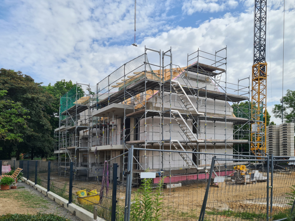 Mit dem Richtfest Anfang Juli war ein wichtiger Meilenstein für die WG Großenhain erreicht. Nach dem Abbruch des alten Bestandsgebäudes entsteht hier in ländlicher Gegend ein modernes Zuhause für fünf Mietparteien.