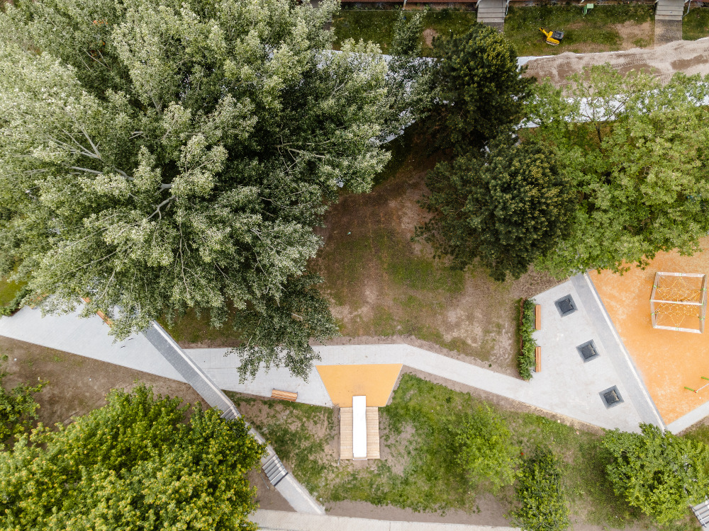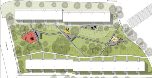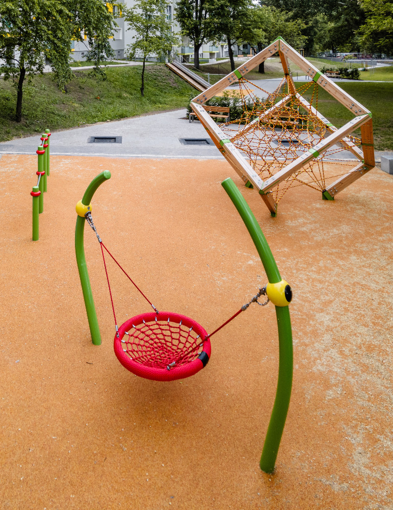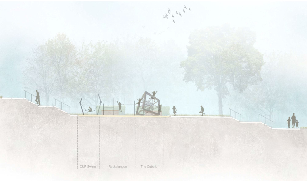 Das Projekt verfolgt somit eine doppelte Nutzungsintention: Auf der Bewegungsebene wird eine nahtlose und barrierearme Verbindung geschaffen, die den Bewohnern neue Möglichkeiten zur gemeinsamen Nutzung des Freiraums bietet. Auf der sozialen Ebene fördern die drei großzügig gestalteten Spielbereiche die Zusammenkunft und Interaktion der Generationen, gerade in Zeiten der Schnelllebigkeit und Digitalisierung ein wichtiges Element. Deshalb sind diese Orte bewusst als soziale Knotenpunkte konzipiert, an denen Kinder spielen und Erwachsene entspannen und sich austauschen können.