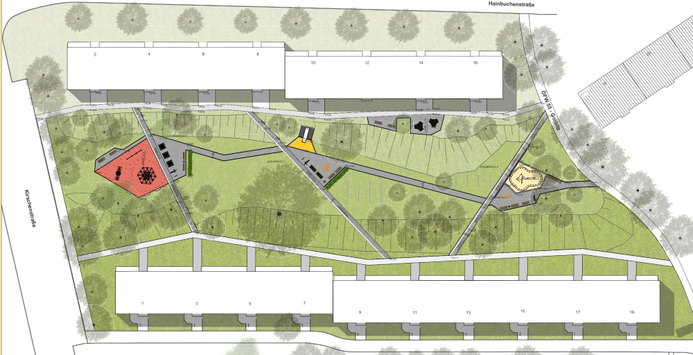Das Besondere an diesem Vorhaben liegt in der Gestaltung der Freianlage. Der zentrale Gedanke besteht darin, die einzelnen Wohnblöcke durch die Freiflächengestaltung des Innenhofs miteinander zu verknüpfen. Dabei fungieren Stichwege als verbindendes Element und bilden das gestalterische Rückgrat des Projekts. Diese Wege schaffen nicht nur räumliche Verbindungen zwischen den verschiedenen Bereichen, sondern bieten den Bewohnern auch eine klare und intuitive Orientierung.