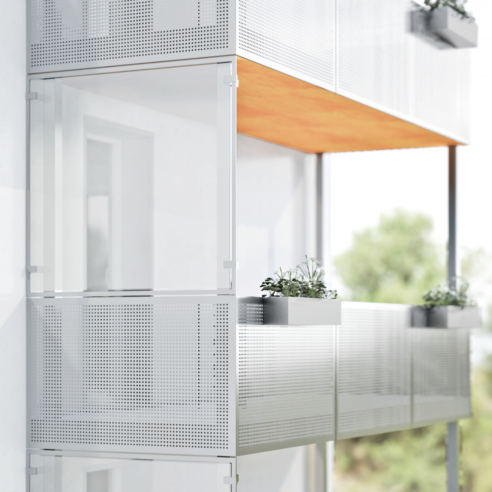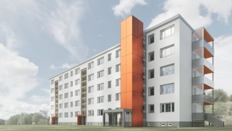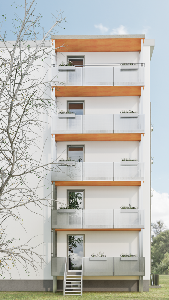Die Fassade des Gebäudekomplexes wird farblich neugestaltet. Dabei werden auch die Brüstungsgeländer der Loggien mit einem neuen Layout versehen und 2 zusätzliche Balkontürme angebaut, um allen Wohneinheiten einen Freisitz zu ermöglichen. Die Giebelwohnung im Erdgeschoss Haus 210 erhält zusätzlich vom Balkon aus, einen Zugang zum Hausgarten.
