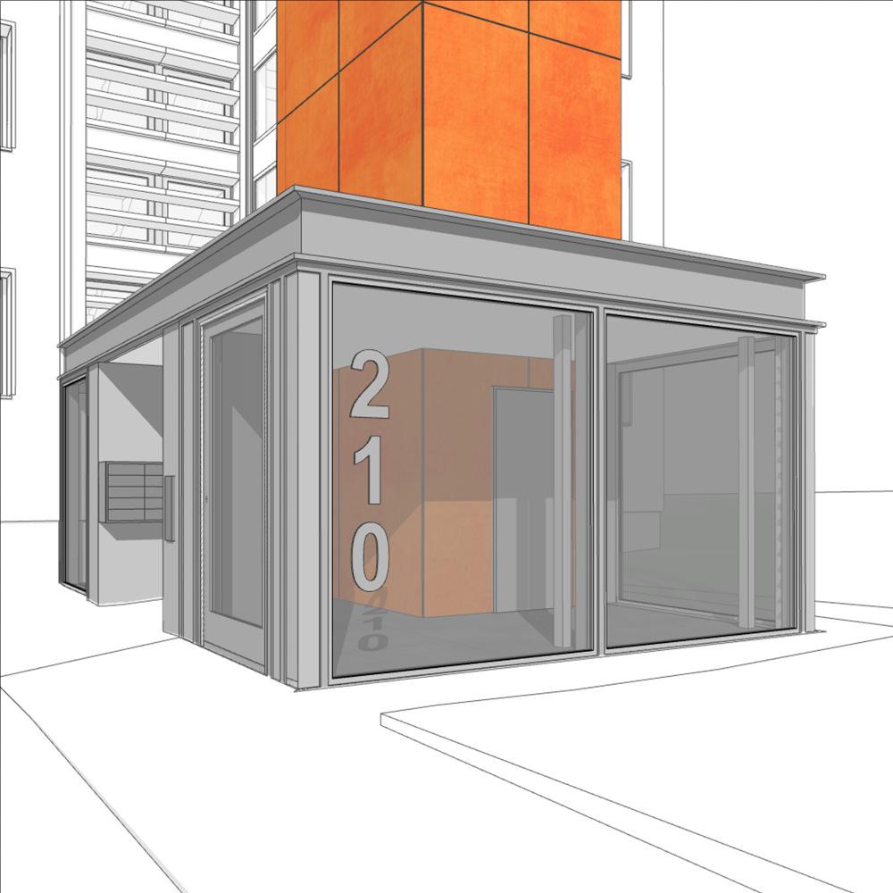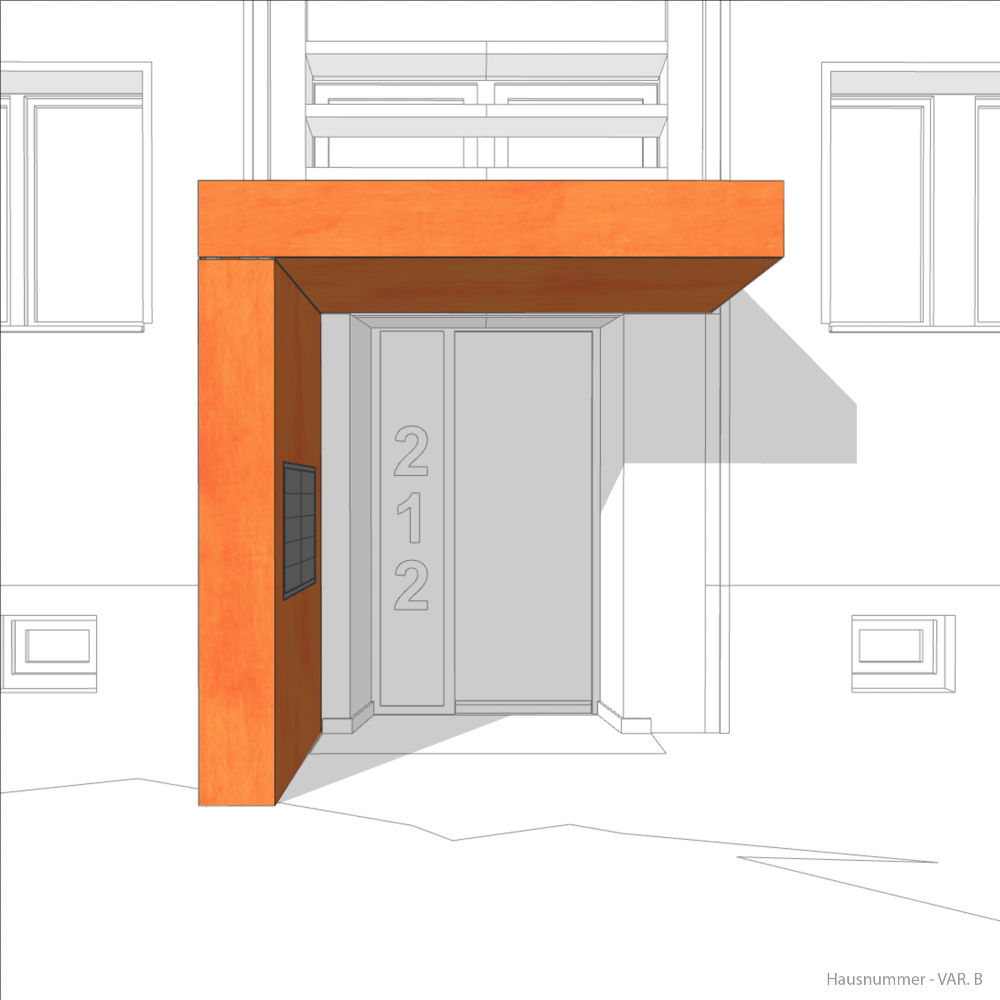 Am Haus 210 wird ein Aufzug mit Vorhaus angebaut, um den Zugang zu den Wohnungen in diesem Hauseingang schwellenlos zu ermöglichen. Die beiden anderen Hauszugänge werden ebenfalls einer Neugestaltung unterzogen und mit einem neuen Vordach versehen.
