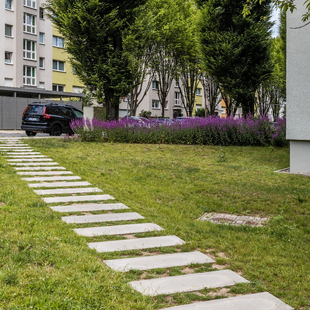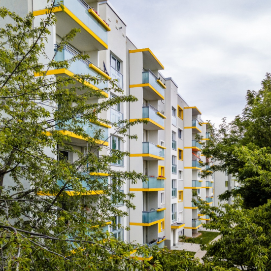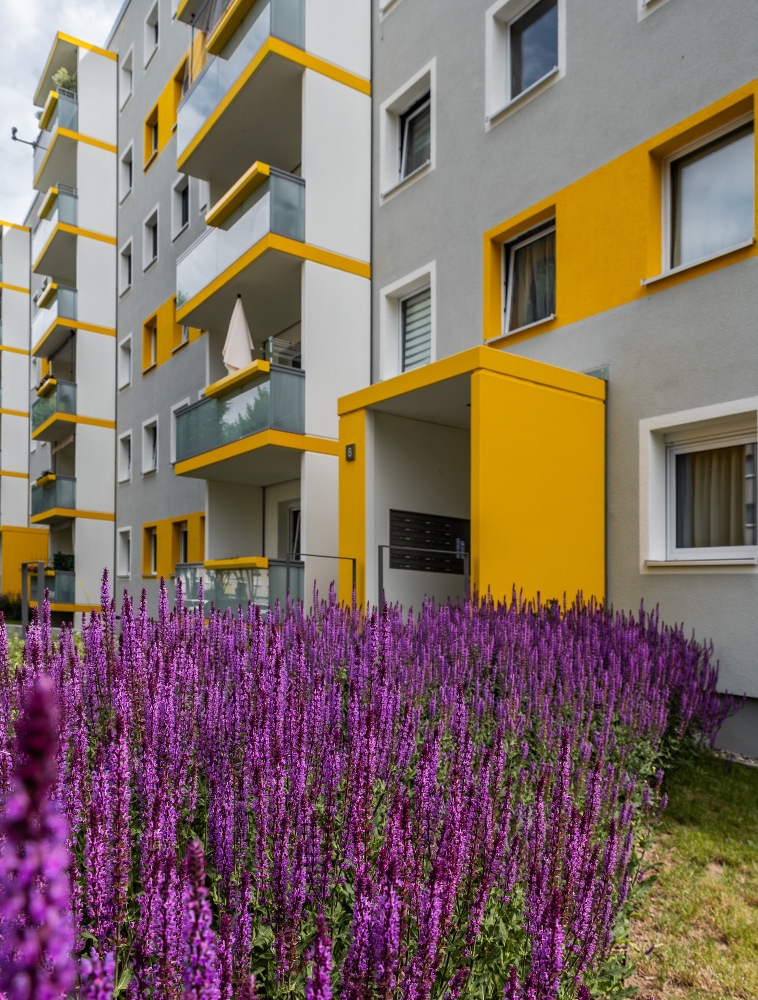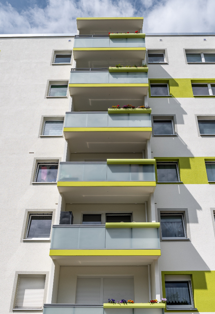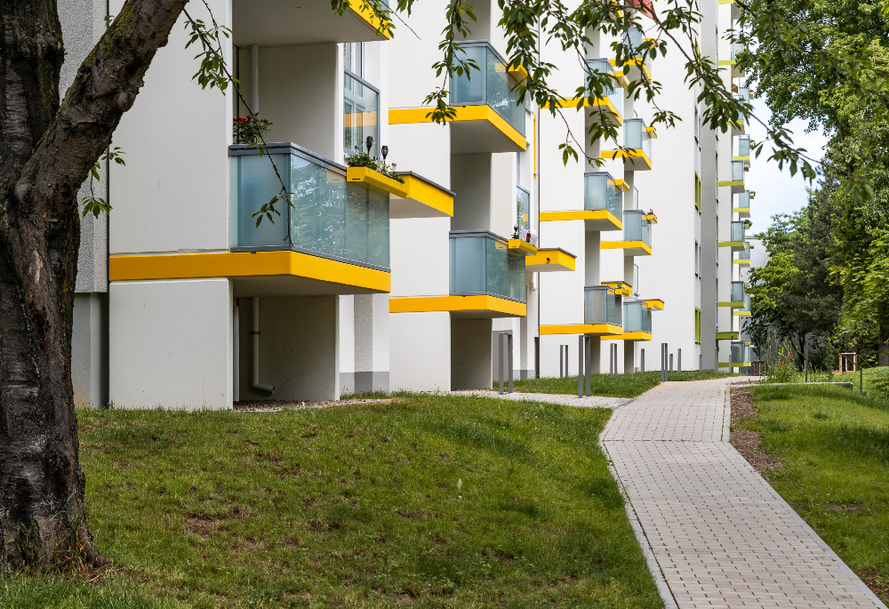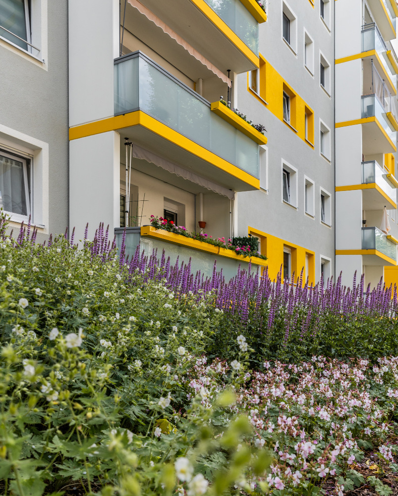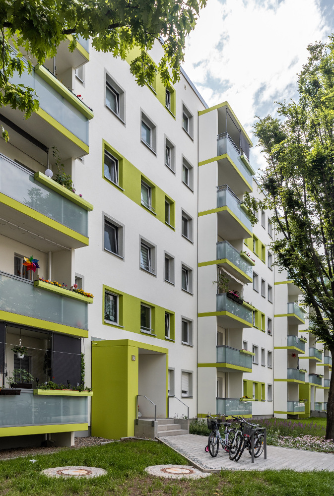 Die geplanten Baumaßnahmen umfassen außerdem die Anbringung eines außenliegenden Wärmedämmverbundsystems zur Verbesserung der Energieeffizienz. Die Grundrisse der Wohnungen werden neu gestaltet und erhalten neue, tiefere Balkone - anstelle der vorhandenen Balkone, die davor abgebrochen werden. So entstehen neue Wohnungstypen, die den modernen Wohnanforderungen eher entsprechen. Durch neue Verbindungsgänge werden fast alle Wohnungen mit einem Aufzug und einem zweiten Treppenhaus verbunden. Für die Giebelwohnungen wird eine Feuerwehrzufahrt hergestellt, um den Sicherheitsanforderungen gerecht zu werden. Bei den Hauseingängen mit den Aufzügen werden die Treppen abgebrochen und so umgestaltet, dass mittels Rampen der Zugang barrierefrei erfolgen kann.