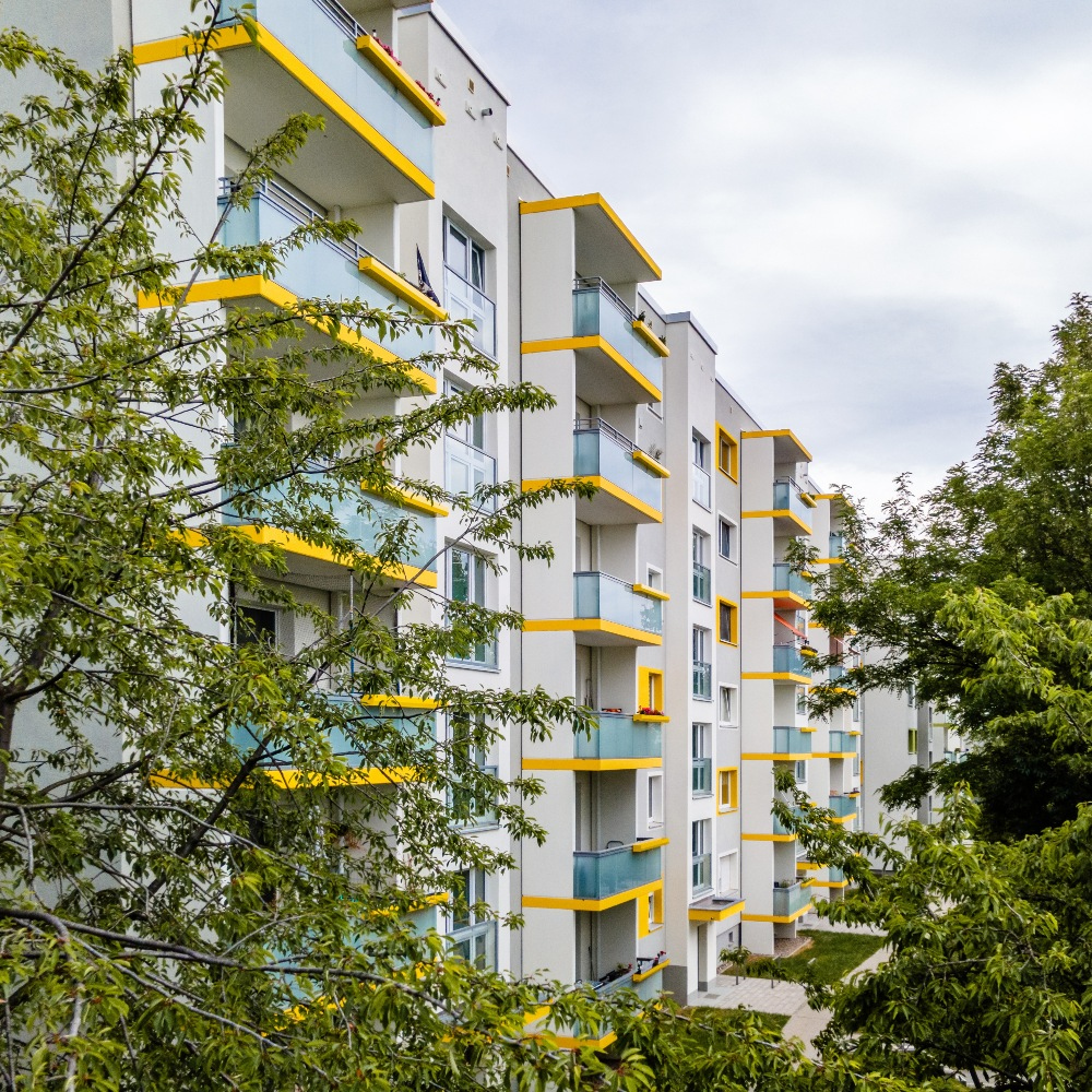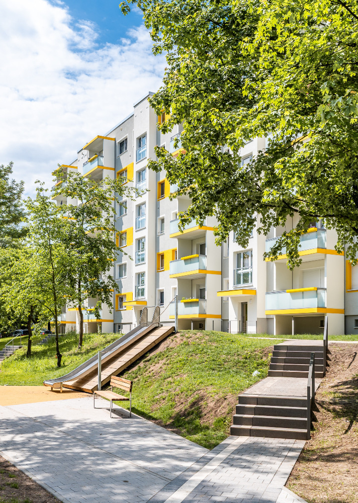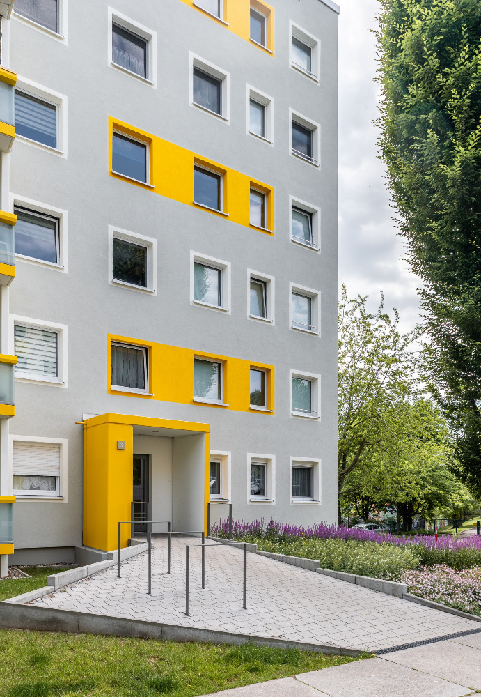 Bei dem Projekt in Dresden-Gorbitz handelt es sich um die Sanierung von sechsgeschossigen Mehrfamilienhäusern in DDR-Plattenbauweise des Typs WBS 70/10,80. Das Bestandsobjekt umfasst in diesem Zusammenhang zwei Wohnblöcke mit jeweils vier Eingängen. Die Aufgabenstellung sieht eine vollständige Sanierung des Bestands vor, einschließlich grundlegender Änderungen der Grundrisse, sodass künftig nur noch insgesamt vier straßenseitige Hauseingänge vorhanden sein werden. Zudem sollen drei neue, innenliegende Aufzüge in den Gebäuden errichtet werden.