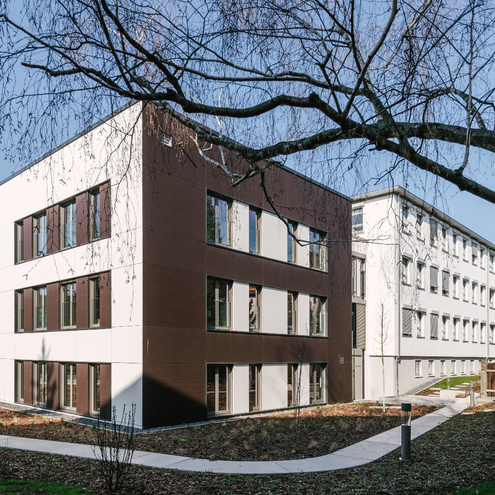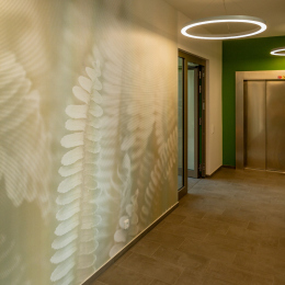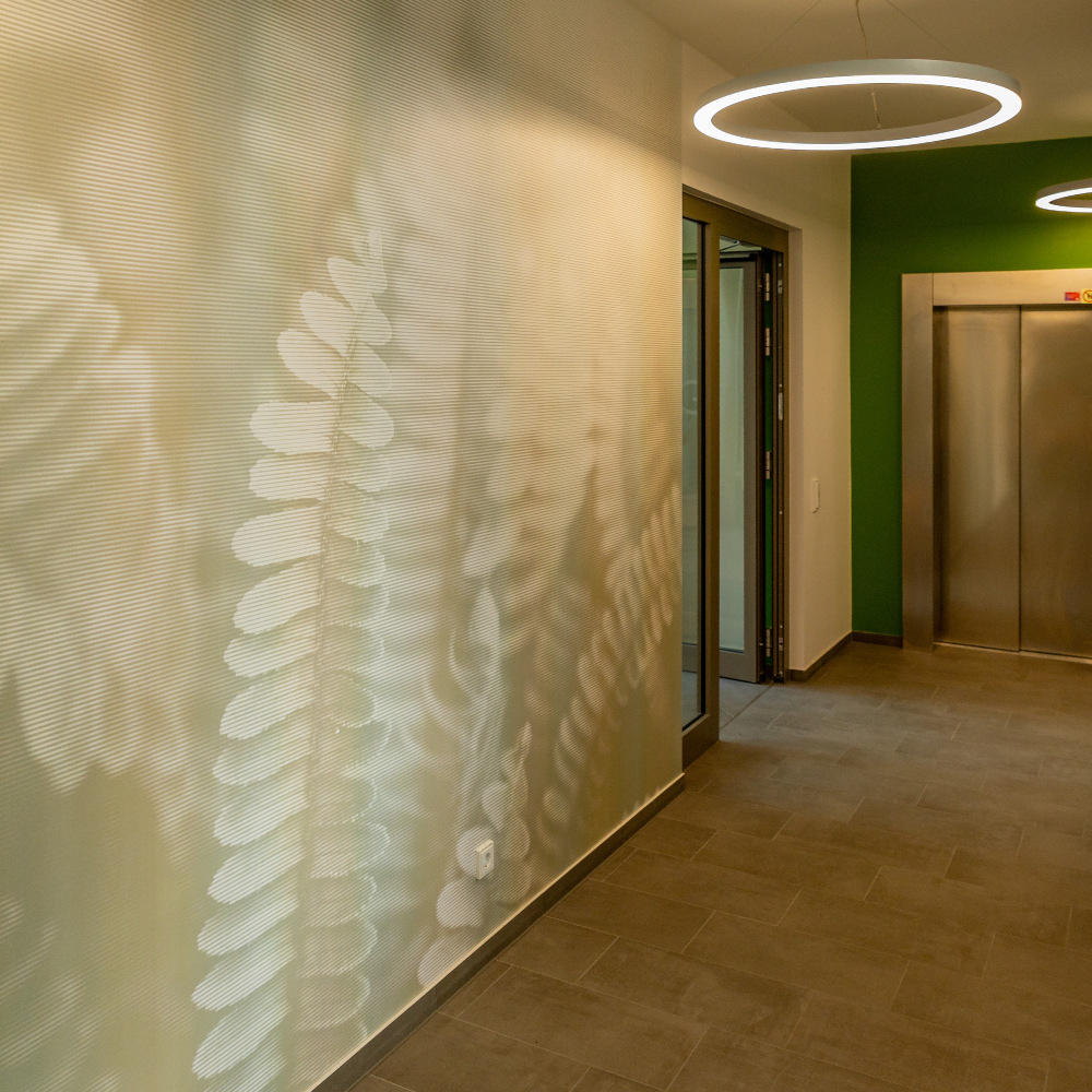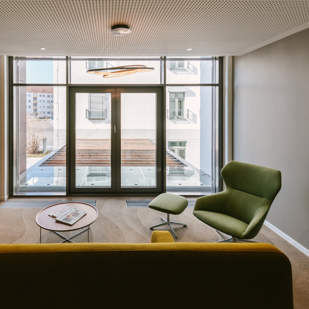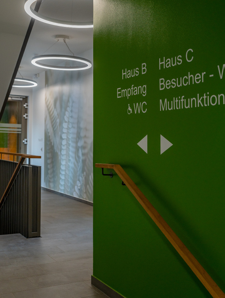 Die grüne Umgebung des Gebäudes wurde aufgegriffen und so der Bezug vom Außenraum zum Innenraum hergestellt. An der Fassade des neuen Anbaus dominieren Holz-Töne und dezente Fensterfarben. Hauptgestaltungsmotiv im Innenbereich ist eine sehr klare Basisgestaltung aus warmen Grautönen, Holzoberflächen und je einer Akzentfarbe pro Etage. Die Farbtöne wurden aus dem Bereich Natur gewählt (kraftvolles Waldgrün, dezentes Wiesengrün, Sanddünen und Sonnengelb). Jedem Farbton sind Assoziationen zugeordnet, in Wort und Schrift oder grafisch als Motivdarstellung. Dies dient der optischen Orientierung und der Hervorhebung von Sonderbereichen wie Empfang, Konferenzraum, Teeküchen, Besprechungsräumen und Wartenischen. Die Sonderbereiche werden zusätzlich akzentuiert ausgeleuchtet.