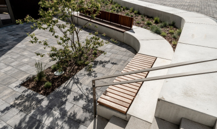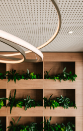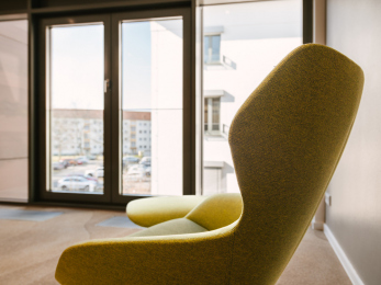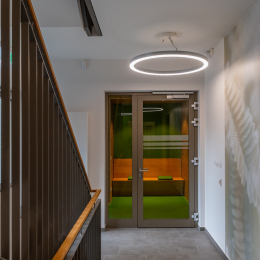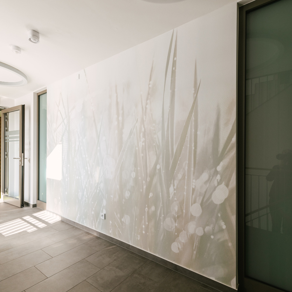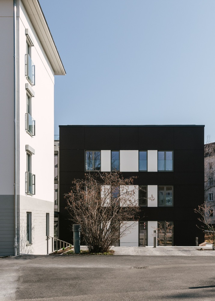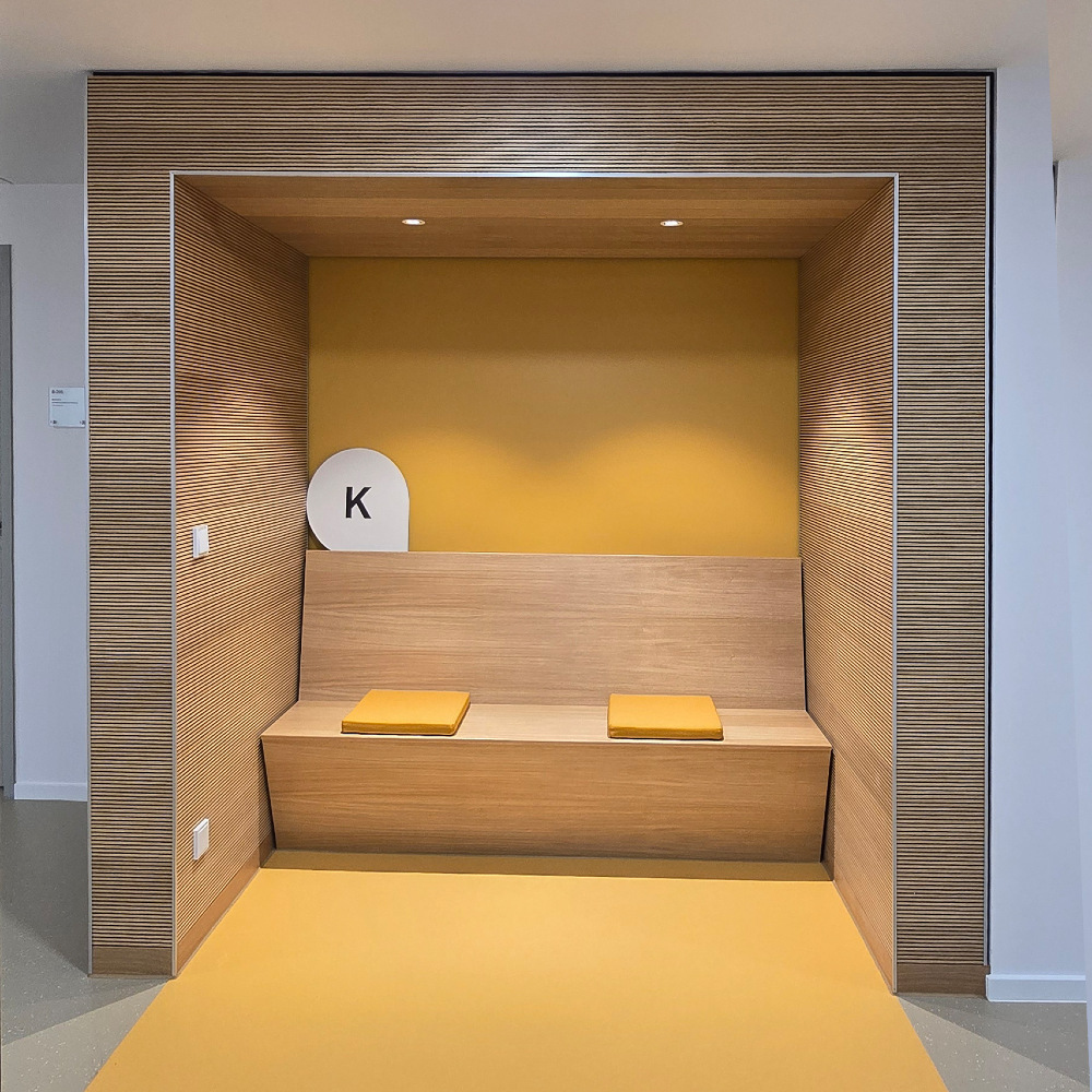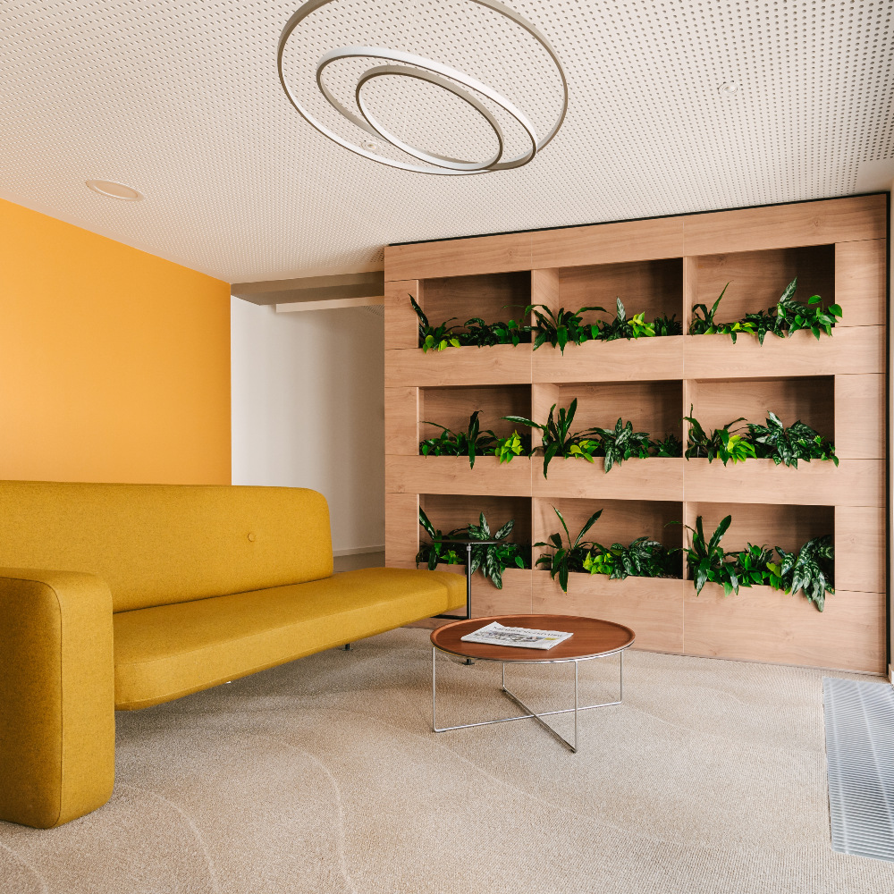 Die grüne Umgebung des Gebäudes wurde aufgegriffen und so der Bezug vom Außenraum zum Innenraum hergestellt. An der Fassade des neuen Anbaus dominieren Holz-Töne und dezente Fensterfarben. Hauptgestaltungsmotiv im Innenbereich ist eine sehr klare Basisgestaltung aus warmen Grautönen, Holzoberflächen und je einer Akzentfarbe pro Etage. Die Farbtöne wurden aus dem Bereich Natur gewählt (kraftvolles Waldgrün, dezentes Wiesengrün, Sanddünen und Sonnengelb). Jedem Farbton sind Assoziationen zugeordnet, in Wort und Schrift oder grafisch als Motivdarstellung. Dies dient der optischen Orientierung und der Hervorhebung von Sonderbereichen wie Empfang, Konferenzraum, Teeküchen, Besprechungsräumen und Wartenischen. Die Sonderbereiche werden zusätzlich akzentuiert ausgeleuchtet.