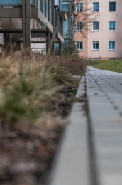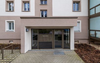 Ein zentraler Bestandteil der Maßnahme war die Zusammenlegung und Reduzierung der Hauseingänge von vier auf zwei. So konnten die Voraussetzungen für zeitgemäße Grundrissänderungen geschaffen und neue 2- bis 4-Raumwohnungen realisiert werden. Mit dem Anbau von acht Balkontürmen wurde das Wohngebäude zugleich funktional ergänzt und in seiner Nutzung spürbar aufgewertet. Auch im Bereich der Erschließung wurde der Bestand weiterentwickelt. Zwei neue Vorhäuser und der Einbau moderner Aufzugsanlagen verbessern den Zugang zum Gebäude und erhöhen den Komfort auf allen Etagen. Ergänzend dazu wurden auf der gegenüberliegenden Straßenseite 23 Stellplätze hergestellt.