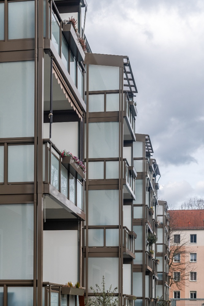 Das Bestandsgebäude, ein viergeschossiges Wohnhaus in Ziegelgroßblockbauweise aus dem Jahr 1961, wurde im Rahmen dieses Vorhabens und im Auftrag der VLW Leipzig eG umfassend saniert sowie an die Anforderungen des Gebäudeenergiegesetzes angepasst.