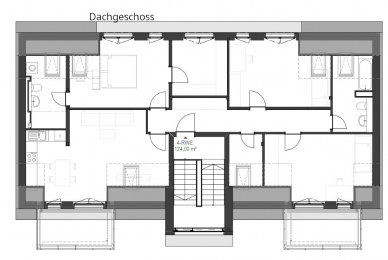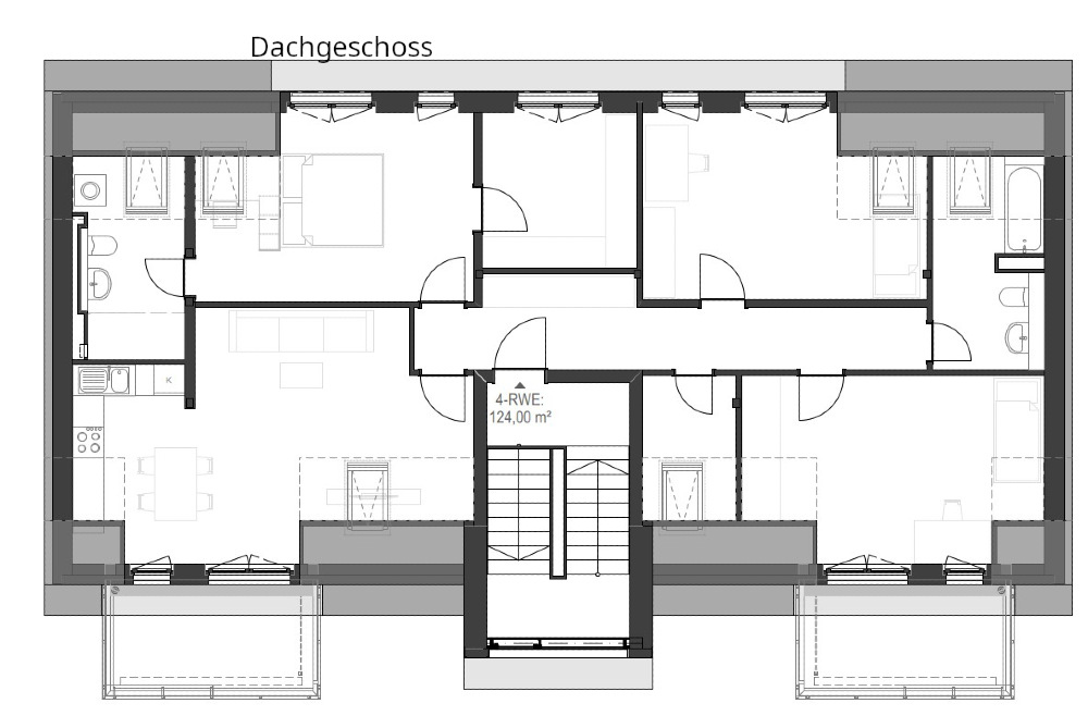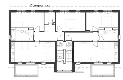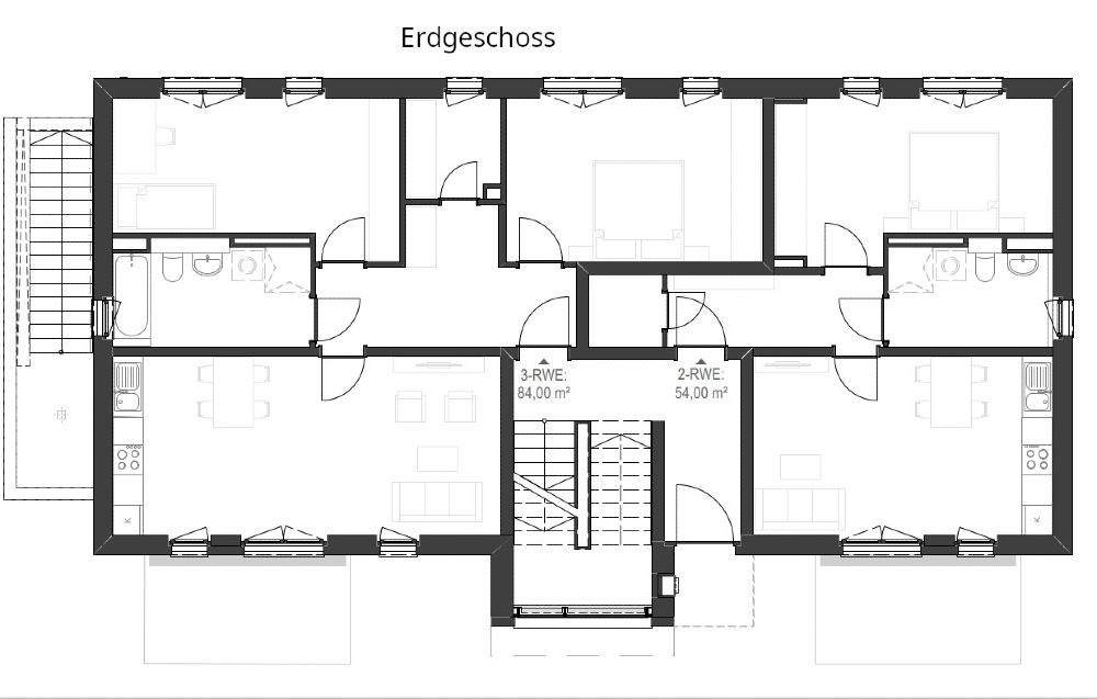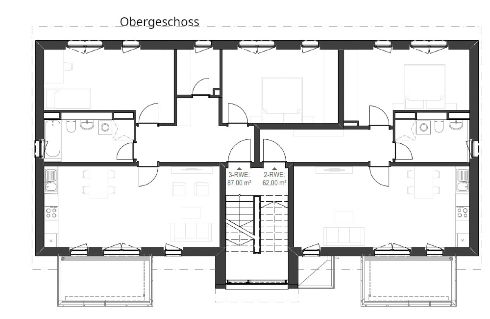Ein effizientes Lüftungskonzept sorgt für hohen Wohnkomfort und Energieeinsparungen: Im Erd- und Obergeschoss werden Pendellüfter mit Wärmerückgewinnung eingesetzt, während das Dachgeschoss für eine optimale Be- und Entlüftung über eine zentrale Lüftungsanlage mit Wärmerückgewinnung verfügen wird. Eine weitere Energiesparmaßnahme ist die Beheizung durch eine Sole-Wasser-Wärmepumpe, die umweltschonend Erdwärme nutzt und Betriebskosten sowie CO₂-Ausstoß senkt.