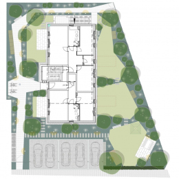 Auf dem Grundstück entstehen zudem fünf Carport-Stellplätze, die den Bewohnern künftig wettergeschützte Stellflächen und die Möglichkeit zum Laden der Elektrofahrzeuge bieten. Am Neubau ist ein Gemeinschaftsbereich geplant für Austausch und Zusammenkommen der Bewohner und die neben dem Grundstück liegende Parkanlage lädt zum Spazierengehen ein.