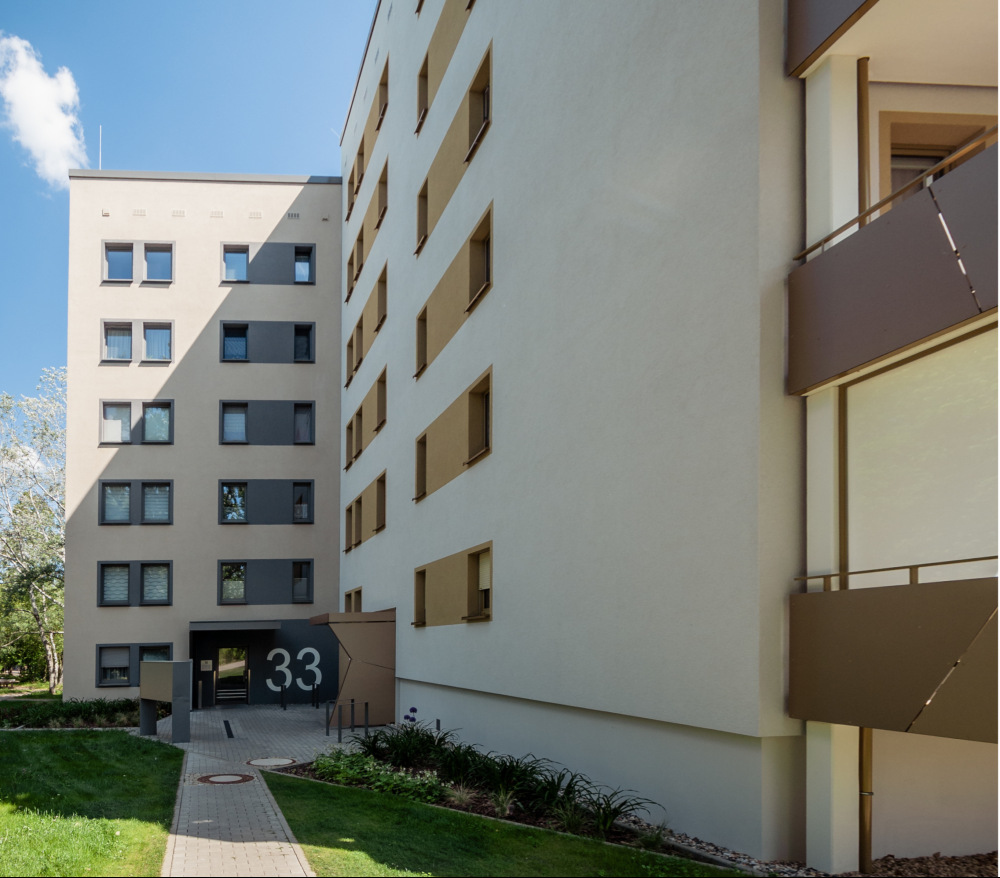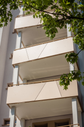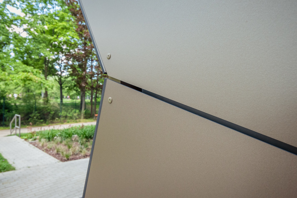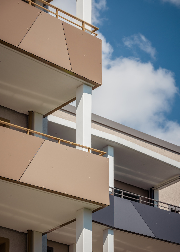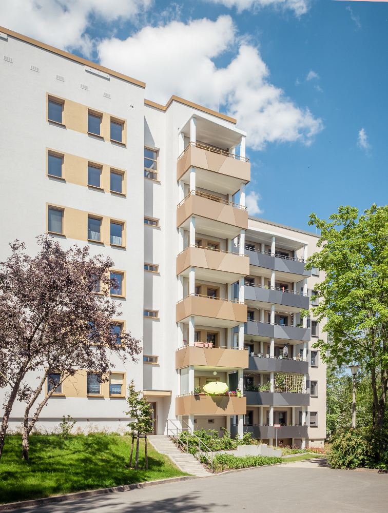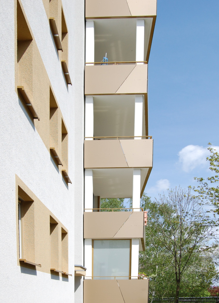 Außerdem war ein wesentliches Element der Sanierung die Erneuerung der Fassade. Durch die Installation eines modernen Wärmedämmverbundsystems und neuer Balkone erhielt das Gebäude ein zeitgemäßes und ansprechendes Erscheinungsbild. Nun fügen sich die eng beieinanderstehenden Häuser harmonisch ineinander, wobei ein elegantes Wechselspiel von Gold- und Grausilber-Tönen dominiert. Die geknickten Balkonfassaden changieren in edlen Metallictönen aus Trespa®-Platten durch aneinander gedrehte unsymmetrische Fassadenplatten und verleihen dem Gebäude so eine dynamische Optik. Die geometrischen Formen der Fassaden setzen sich auch im Inneren des Gebäudes fort, insbesondere in der Gestaltung der Treppenhäuser, der Freianlagen sowie der Badfliesen.