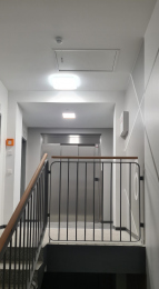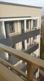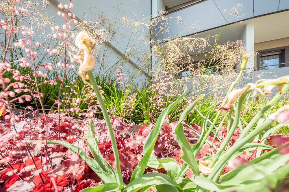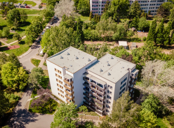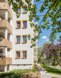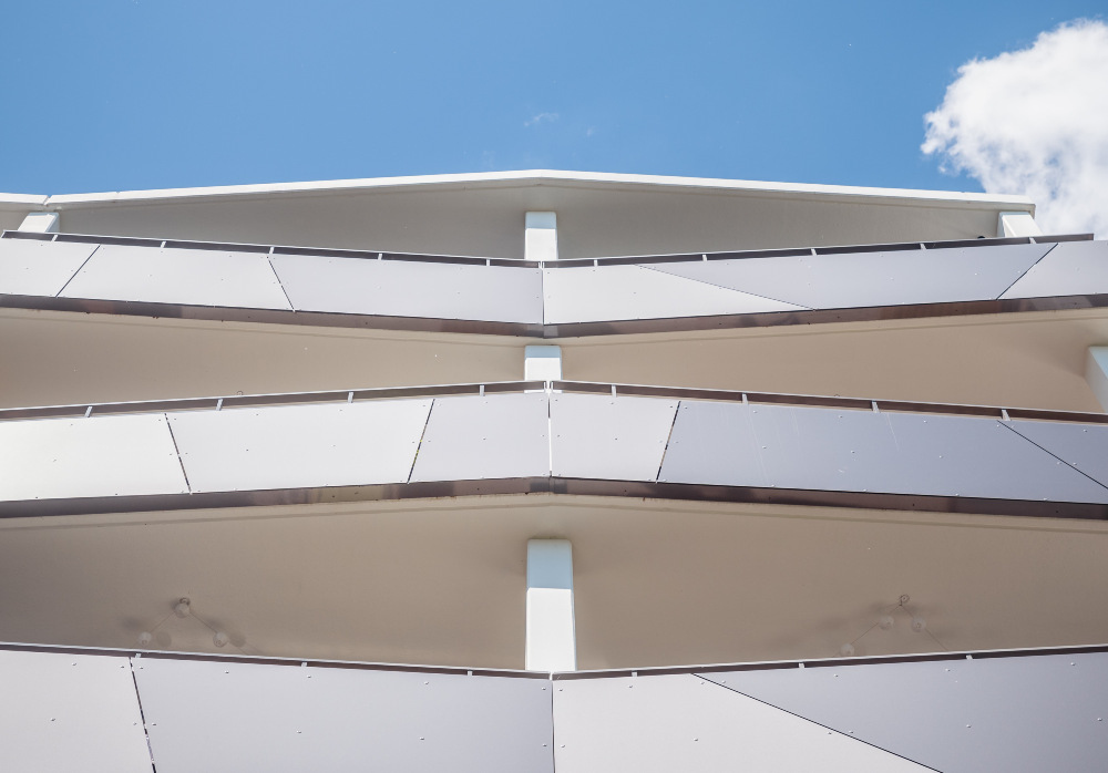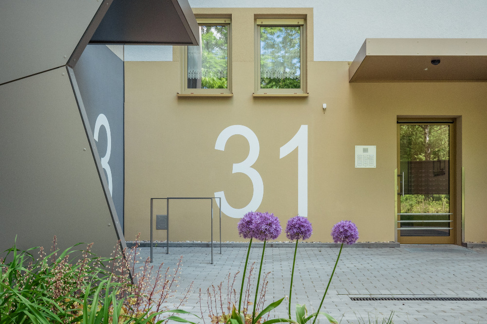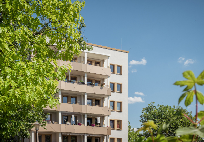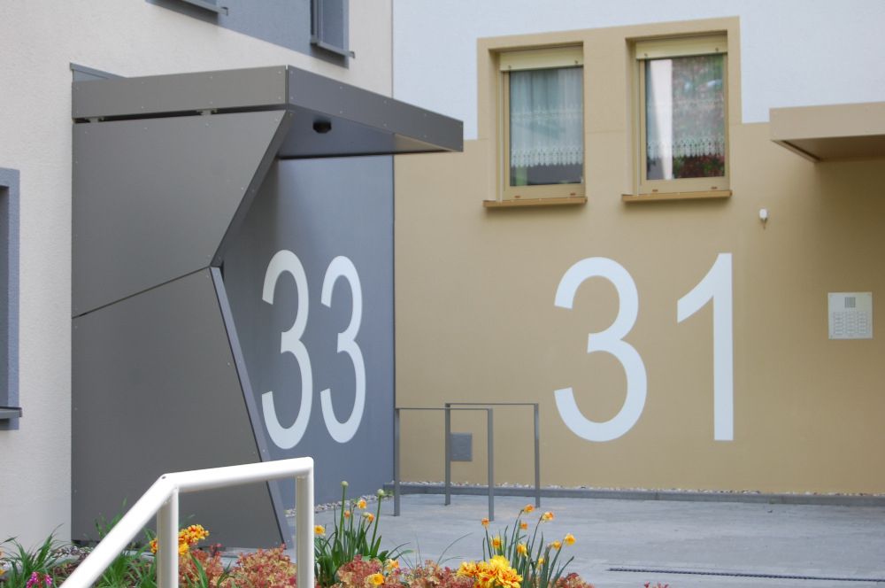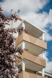 Außerdem war ein wesentliches Element der Sanierung die Erneuerung der Fassade. Durch die Installation eines modernen Wärmedämmverbundsystems und neuer Balkone erhielt das Gebäude ein zeitgemäßes und ansprechendes Erscheinungsbild. Nun fügen sich die eng beieinanderstehenden Häuser harmonisch ineinander, wobei ein elegantes Wechselspiel von Gold- und Grausilber-Tönen dominiert. Die geknickten Balkonfassaden changieren in edlen Metallictönen aus Trespa®-Platten durch aneinander gedrehte unsymmetrische Fassadenplatten und verleihen dem Gebäude so eine dynamische Optik. Die geometrischen Formen der Fassaden setzen sich auch im Inneren des Gebäudes fort, insbesondere in der Gestaltung der Treppenhäuser, der Freianlagen sowie der Badfliesen.