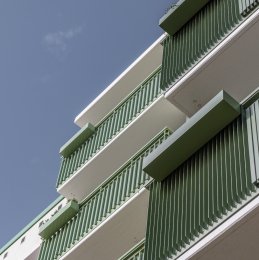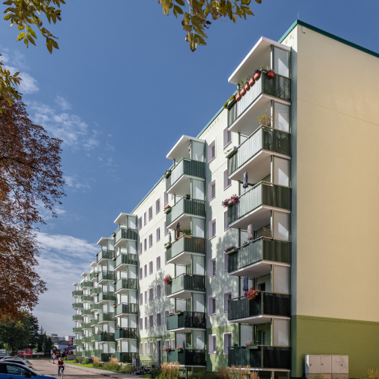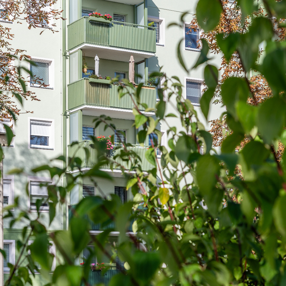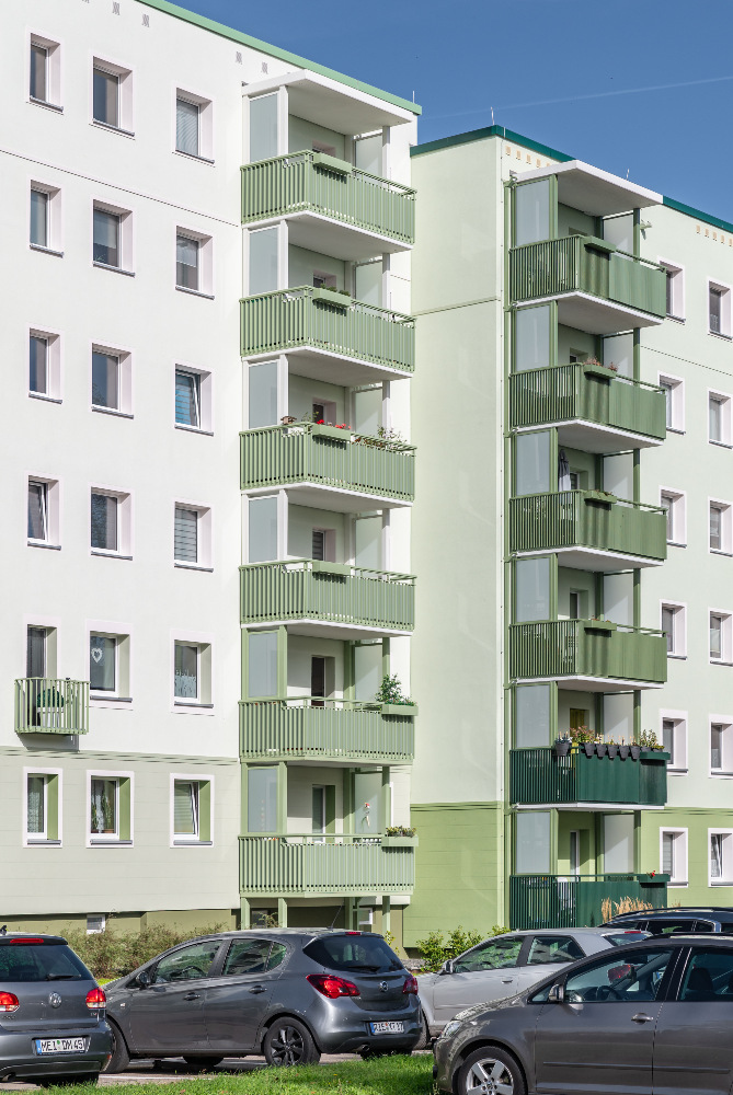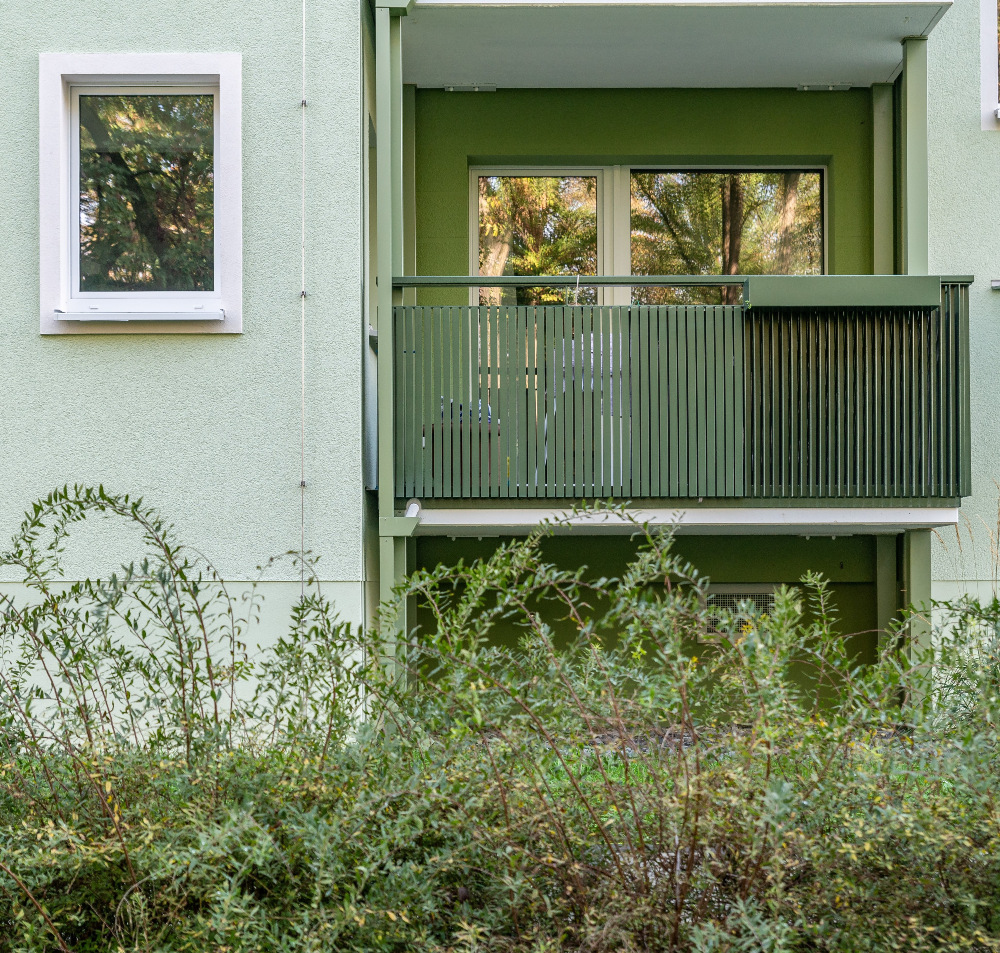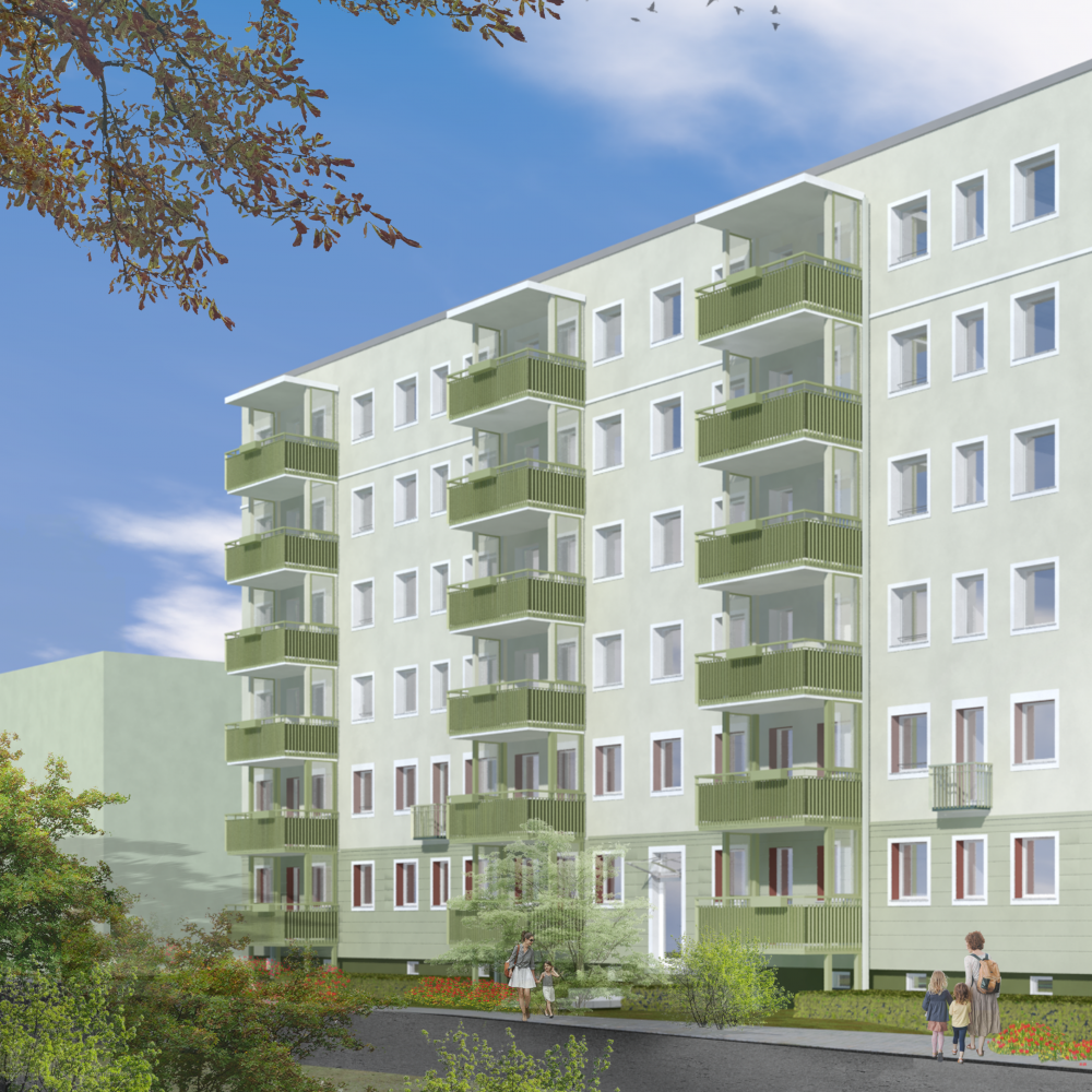 Darüber hinaus werden die bestehenden 36 Balkone entfernt und durch vier Balkontürme mit jeweils sechs Balkonen an der Hauptfront ersetzt. Zusätzlich fügen wir zwei weitere Türme mit jeweils sechs Balkonen auf der Hofseite hinzu, sodass keine der Wohnungen auf einen Freisitz verzichten muss.