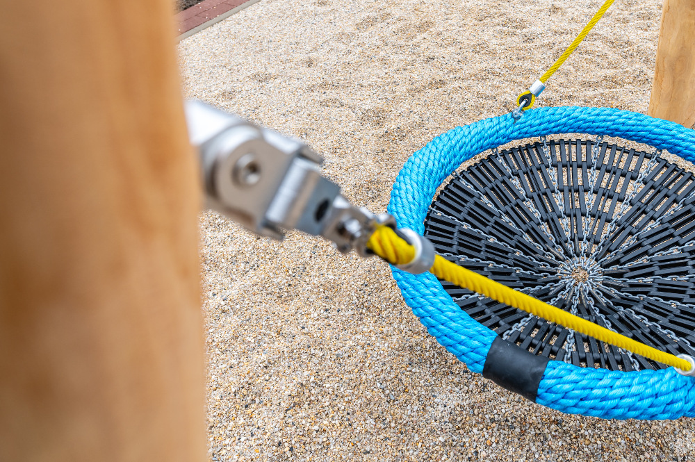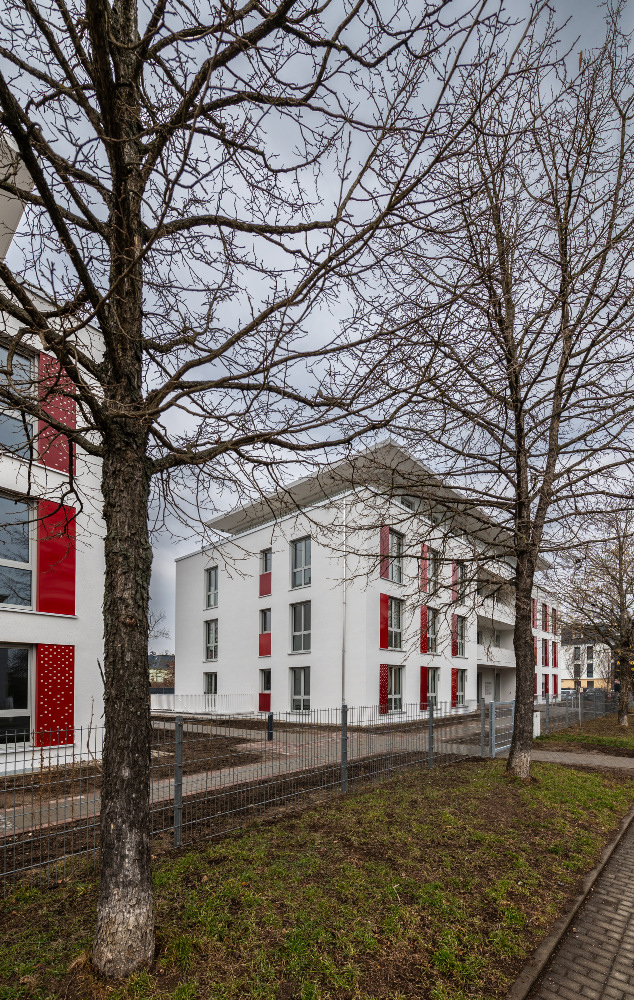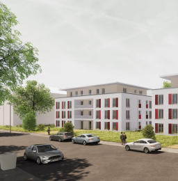 Die Außenanlage der Mehrfamilienhäuser lädt in ein lebendiges, familienfreundliches und barrierefreies Umfeld ein. Im Zentrum befindet sich ein großzügiger Spielplatz, der dank des Erhalts von Bestandsbäumen natürlichen Schatten spendet und das Mikroklima verbessert. Ausgestattet ist der Spielplatz mit einer Nestschaukel, einem Wipptier und einem Sandkasten, der durch einen höhenverstellbaren Sonnenschirm vor der Sonne geschützt wird. Direkt daneben lädt ein Aufenthaltsbereich zum Entspannen ein und bietet Platz für gemeinsame Treffen mit Nachbarn.