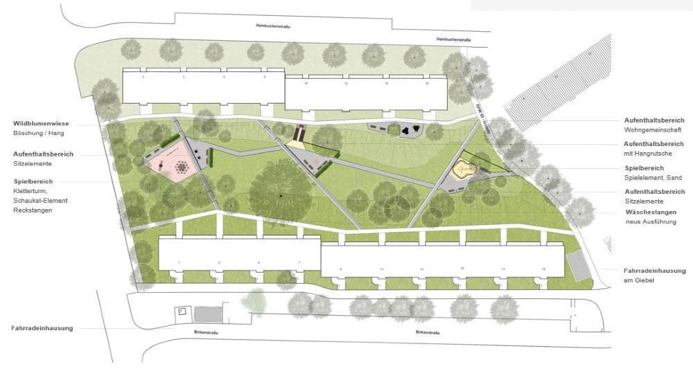 Es werden somit direkte und barrierearme Verbindung geschaffen, die es den Bewohnern ermöglichen den neu definierten Raum gemeinsam zu nutzen. Eine Abfolge von Spiel- und Aktionsflächen, beschatteten Aufenthalts- und Kommunikationsbereichen und frei erschließbaren Wiesenbereichen ermöglicht eine starke Interaktion der Bewohner.