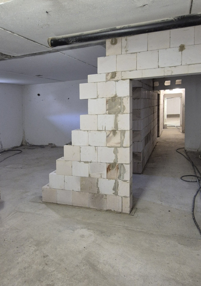 Nun werden im Gebäudeinneren neue Aufzugsschächte und Wohnungstrennwände gemauert, die dann die Grundlage für die neuen Wohnungsgrundrisse sind.