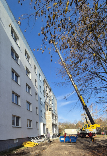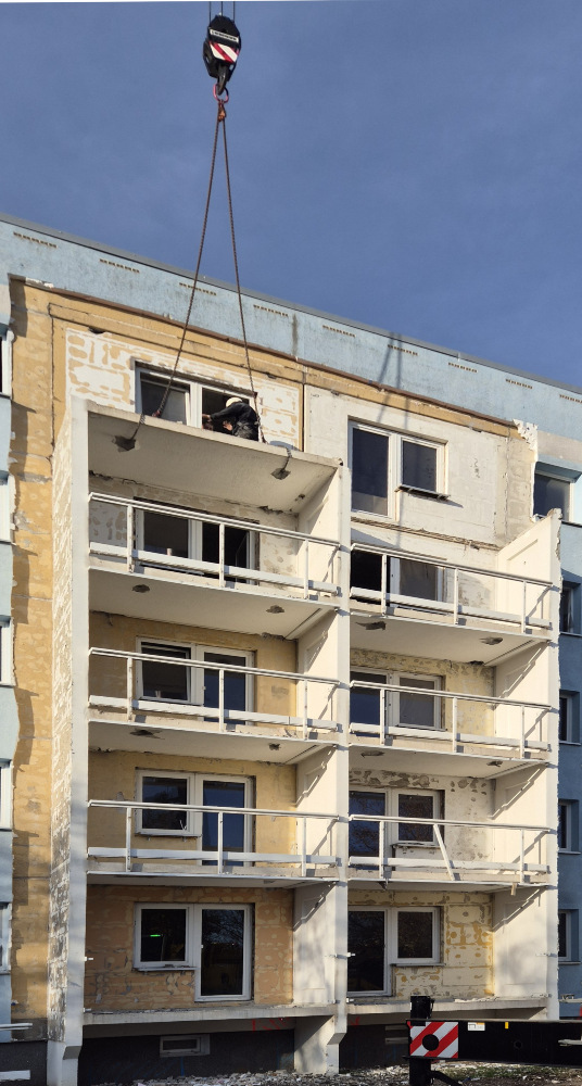An der Fassade wurden die Bestandsbalkone zurückgebaut und derzeit werden die Fundamente für die neuen Balkonanlagen hergestellt.