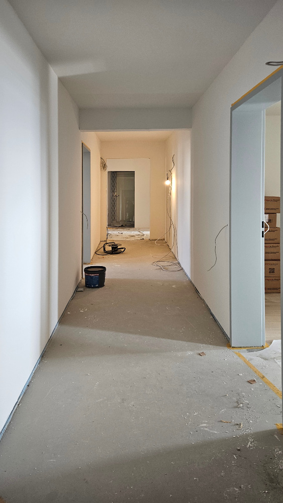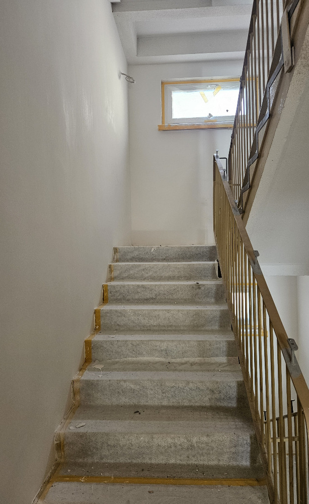 Im Inneren sind die HLS-Installationen komplett eingebaut, und auch der neue Aufzug ist bereits installiert. Der Innenausbau (Maler, Fliesenleger, Bodenlegen, Innentüren) läuft auf Hochtouren, die barrierefreie Eingangsrampe befindet sich in der finalen Ausführung.