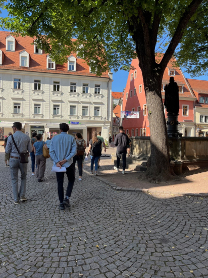 Das komplette Team 1 der Architekturabteilung traf sich bei bestem Sommerwetter auf dem Marktplatz des malerischen Städtchens an der Elbe für den geplanten Stadtrundgang. Durch idyllische kleine Gassen führte der Weg zuerst zur Frauenkirche Meißens. Bei der Fotoausstellung „Kehrseiten – Eine Stadtwanderung durch das alte Meißen“ im Inneren der Kirche wurde auf mehr als hundert Fotos der bauliche Zustand der Stadt in den 1980er-Jahren dargestellt. Dies glich einer historischen Zeitreise. Auf dem weiteren Weg zum Meißner Dom wurde ein kurzer Zwischenstopp eingelegt, um das Traditionsgebäck „Meißner Fummel“ zu verköstigen.