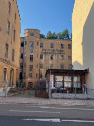Oben auf dem Domplatz angekommen, bot sich ein fantastischer Ausblick auf die Stadt. Die Anlage um Dom und Albrechtsburg wird gerade (oder immer noch) durch Fassadenkartierung aufgenommen. In der Allerheiligenkapelle konnten wir mit der Restauratorin ins Gespräch kommen und uns Erläuterungen zur denkmalgerechten Instandsetzung der mittelalterlichen Glasfenster einholen. Der Weg wieder hinunter in die Stadt führte uns vorbei an DDR-Industriearchitektur, an der leider der Verfall ungeschönt sichtbar ist. Endpunkt des Stadtrundgangs bildete der Firmensitz der staatlichen Porzellan-Manufaktur Meißen GmbH.