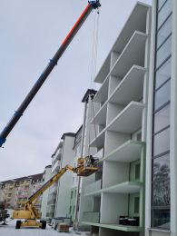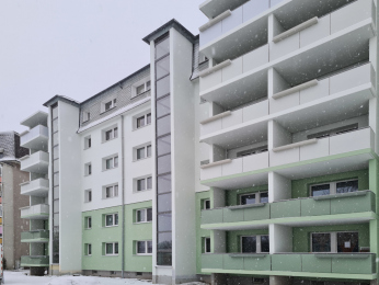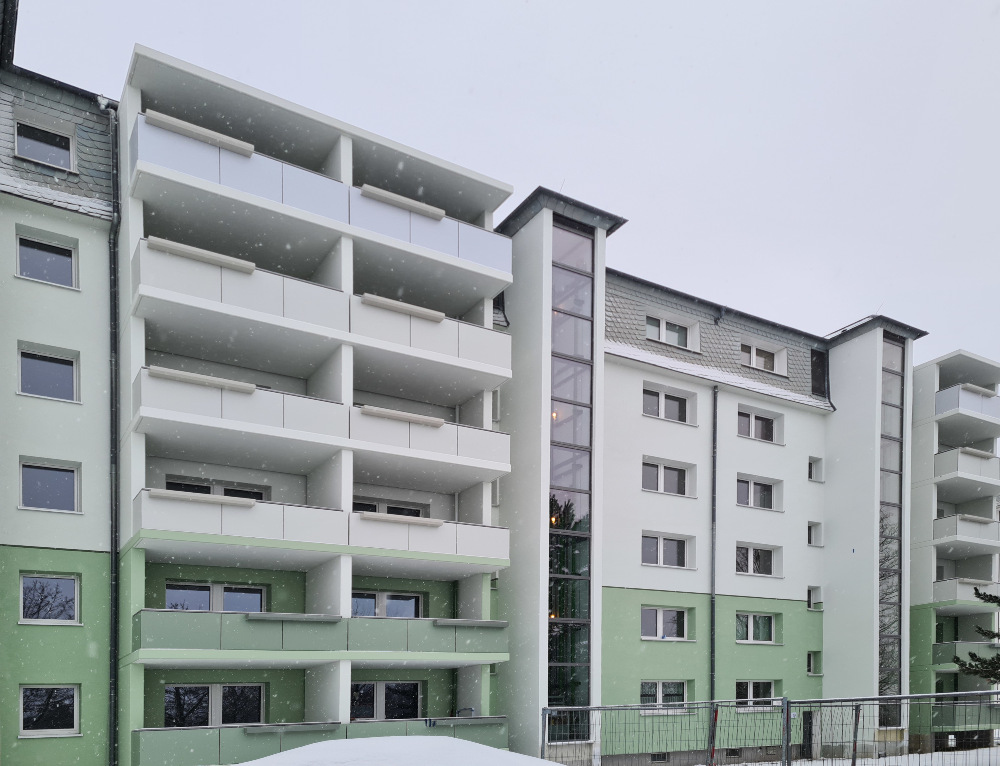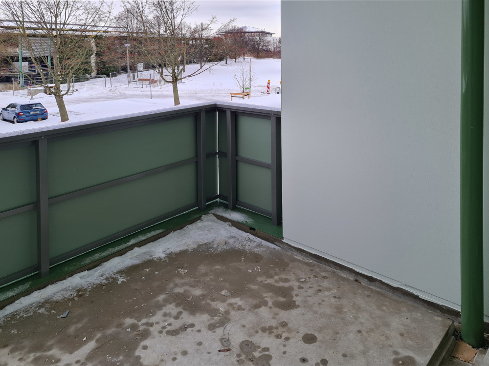 Die Arbeiten am Mehrfamilienhaus in der Paul-Müller-Straße 35-45 befinden sich in den letzten Zügen – und das im wahrsten Sinne des Wortes. Nachdem im Februar noch einmal richtig Gas gegeben wurde, konnten die Balkonbrüstungen termingerecht montiert werden. Damit zeigt sich die Fassade nun in ihrem finalen Erscheinungsbild und rundet das Gesamtbild des Gebäudes harmonisch ab.