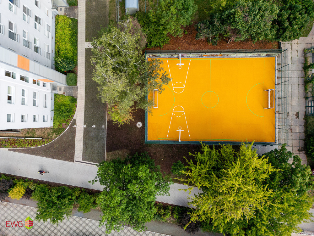 Ein besonderes Highlight stellt der neue, wasserdurchlässige EPDM-Sportbelag dar. Auf einer Fläche von über 350 m² bietet er mit seiner gold-gelben Farbgebung nicht nur ideale Spielbedingungen, sondern prägt auch das ästhetische Erscheinungsbild des gesamten Platzes maßgeblich.