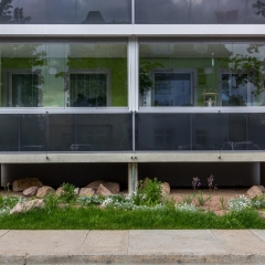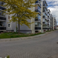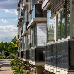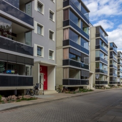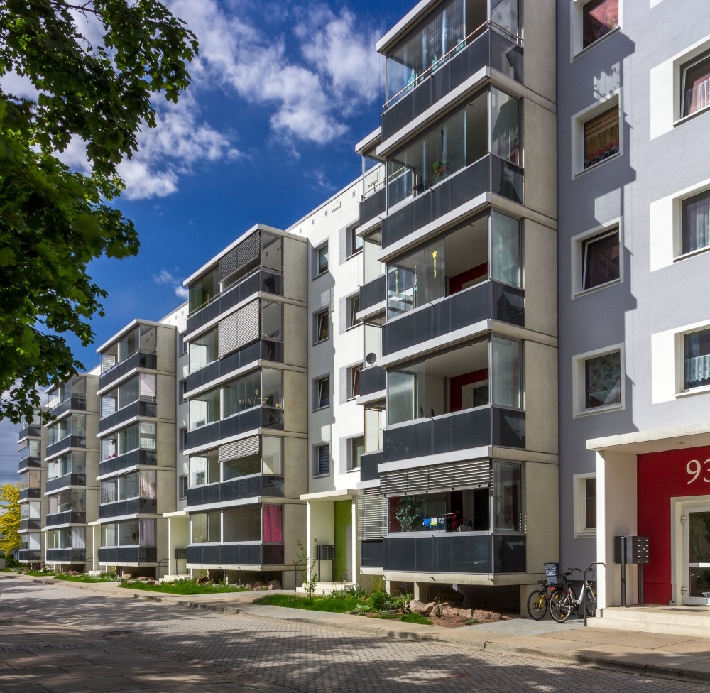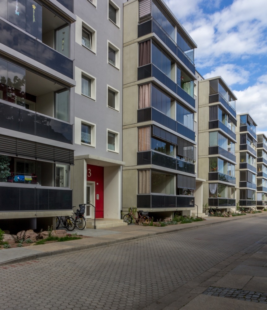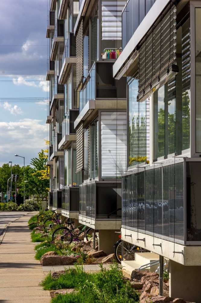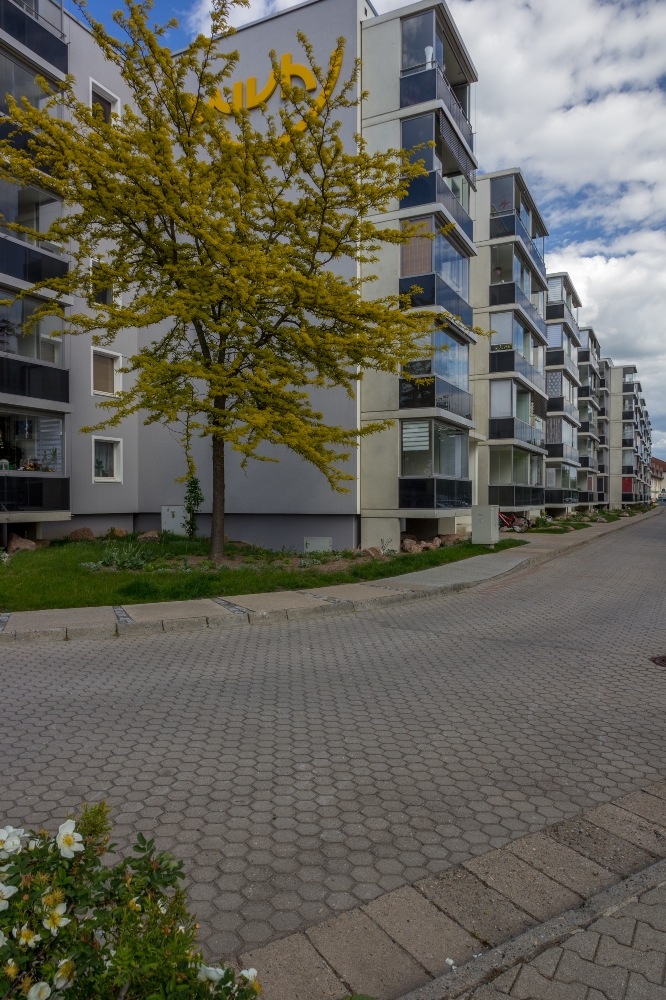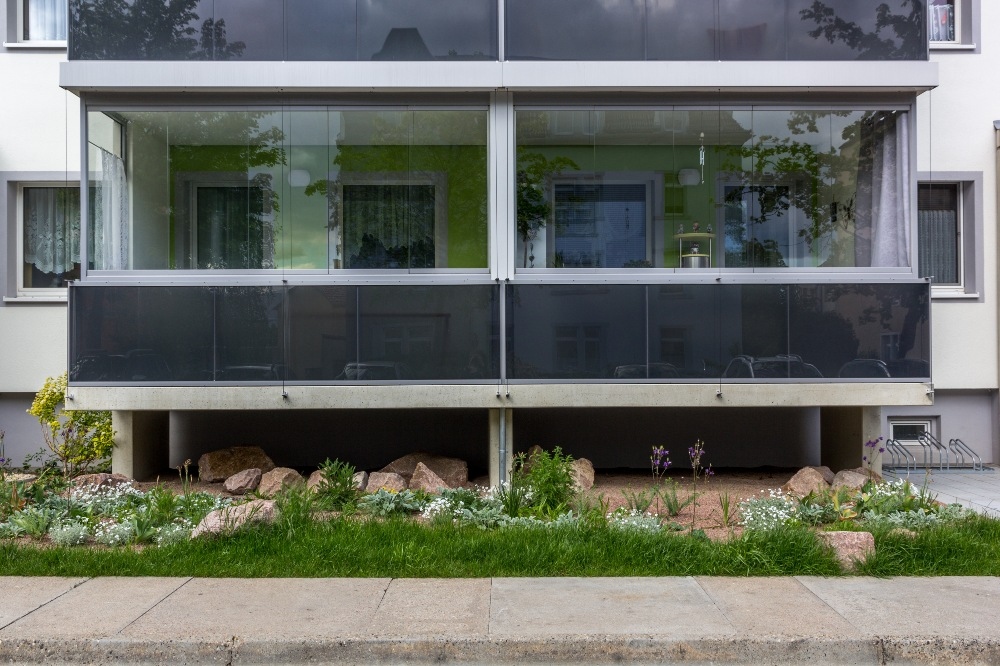 Die strassenseitige Gebäudefassade erhielt eine Wärmedämmung sowie Neugestaltung. Durch die neuen großzügigen Balkone mit Schiebeverglasung und Sonnenschutz kann jeder Mieter die Verbesserungen seiner Wohnbedingungen hautnah spüren.