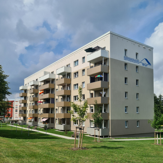 Die WG Frankenberg hat IGC mit der Sanierung und dem Umbau dieses sechsgeschossigen Wohngebäudes vom Typ WBS 70 IW83 beauftragt. Ursprünglich gab es im Gebäude 48 Wohneinheiten, die über vier Hauseingänge zugänglich waren. Mit einem durchdachten Wohnraumkonzept wurden die Grundrisse maßgeblich verändert und das Gebäude auf moderne Wohnstandards angepasst, wodurch nun 42 geräumige Wohneinheiten entstanden - ein gelungener Mix an größeren und kleineren Wohnungen für Jung und Alt. Außerdem wurden die vier Hauseingänge in zwei barrierefreie Haupteingänge mit Vorhäusern und zwei überdachte Nebeneingänge umgebaut. Zur Erhöhung der Zugänglichkeit wurden zwei Aufzüge eingebaut, die den barrierearmen Wohnraum erweiterten. Des Weiteren wurden sieben Balkontürme installiert und neue Zuwegungen geschaffen, was die Wohnqualität erheblich steigert. Ein zentrales Element des Projekts war auch die grundlegende Anpassung der Medien.
