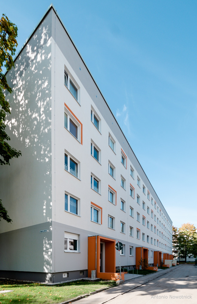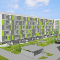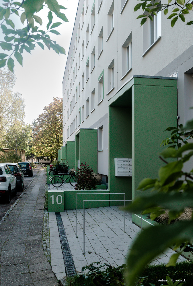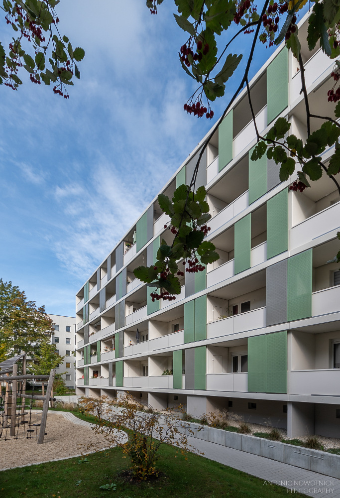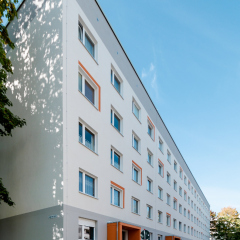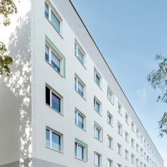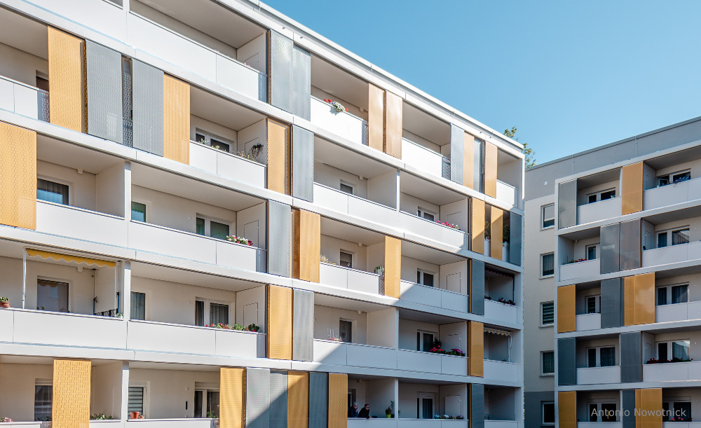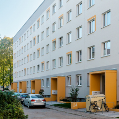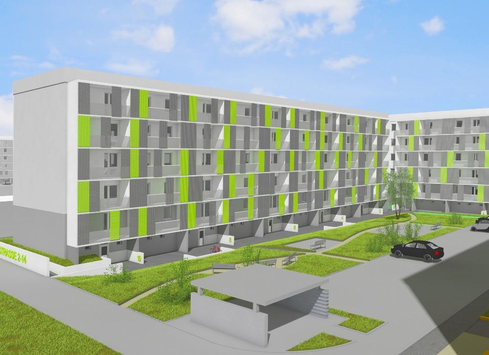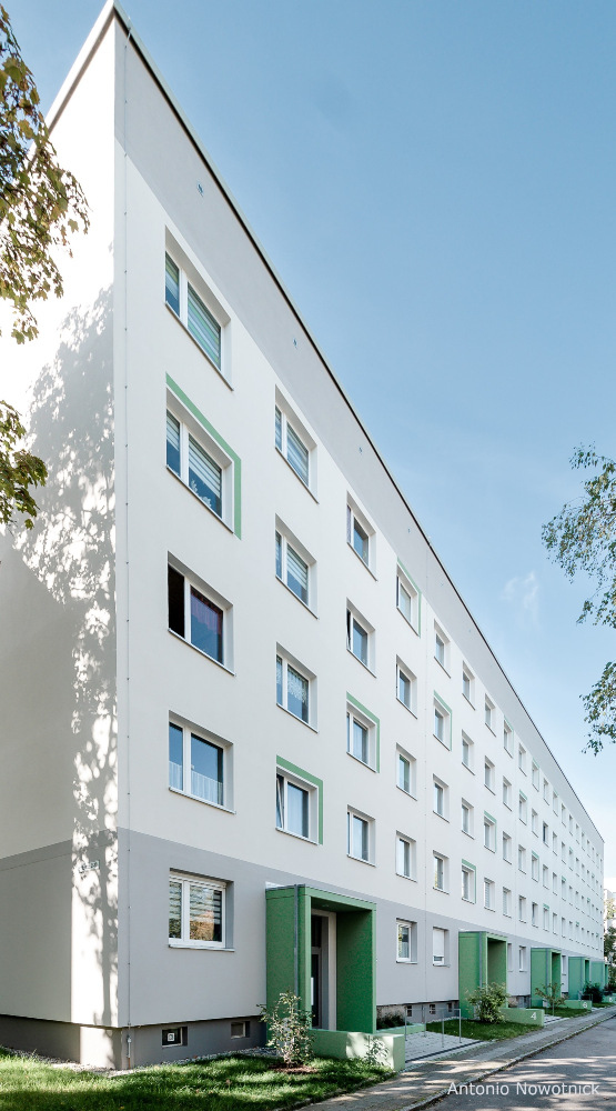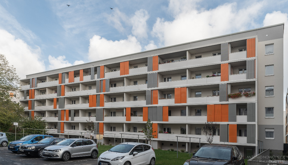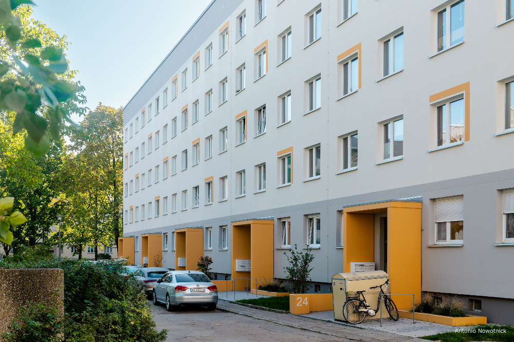 In der Enderstraße 2-42 werden Plattenbauten zukunftsfähig gemacht. Durch das Absenken des Eingangsniveaus auf der Hofseite und den Einbau von 21 neuen Aufzügen werden alle Wohnungen barrierefrei erreichbar. Hiermit sinnvoll verbunden wird eine aufwertende Umgestaltung der Freianlagen der Innenhöfe realisiert. Der Komfort für die Mieter erhöht sich durch den Neubau großer Balkonanlagen mit modernen Schiebeläden und Abstellbereichen. Abgerundet wird die Modernisierung durch neue Eingangsbereiche auf der Straßenseite.