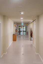 Das Gebäude bietet im Erdgeschoss Gruppenzimmer, Therapieräume, Sanitäreinrichtungen, eine Küche und im Obergeschoss weitere Gruppenzimmer sowie Büroräume. Die Planung und Gestaltung des Gebäudes, welches 70 Container umfasst, erforderte sorgfältige Überlegungen, um das zunächst simple scheinende Projekt umzusetzen. Doch diese zahlt sich aus, denn so können beispielsweise die Innenräume der Kita mit konventionellen Neubauten mithalten und eine farbig getsaltete Fassade lenkt darüber hinaus von dem sonst so tristen Containerbild ab.