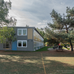 Die Stadt Dresden beauftragte die IGC GmbH als Generalplaner mit dem Neubau der Interimskita "Heideland", da der alte Kindergarten aufgrund von Schadstoffbelastungen abgerissen und durch einen neuen Komplex ersetzt werden musste.