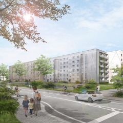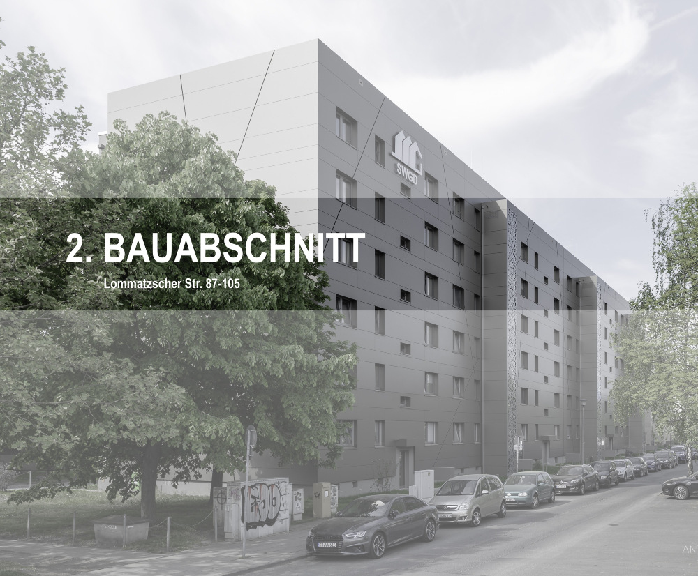 Das Wohngebiet der SWG an der Lommatzscher Straße wird von 2020 bis Ende 2024 saniert. An den bestehenden 6-geschossigen WBS70-Wohngebäuden werden unter anderem Außenaufzüge angebaut, Balkonbrüstungen erneuert, die Fassaden energetisch ertüchtigt und die Freianlagen für alle Nutzergruppen aufgewertet.