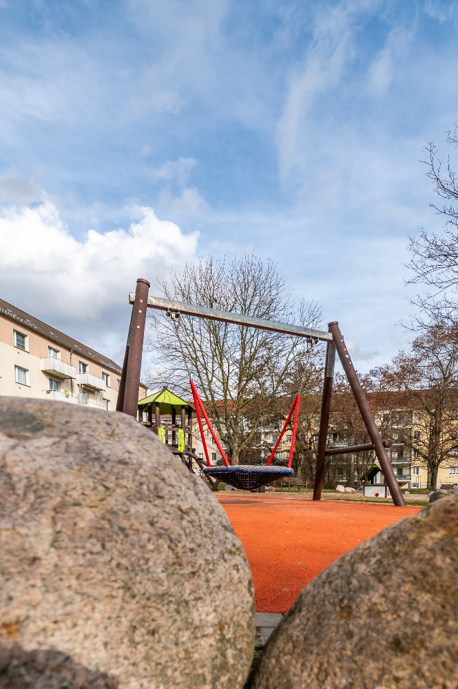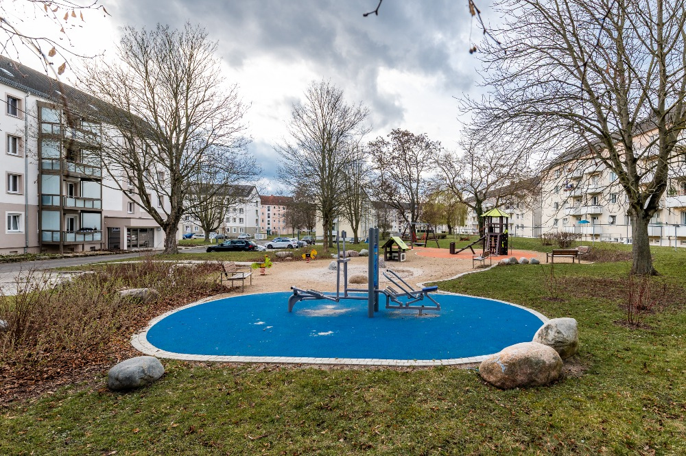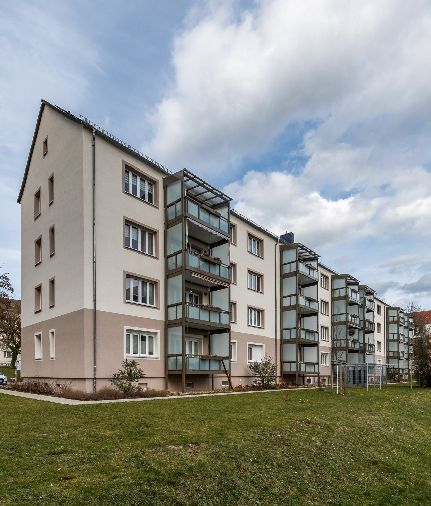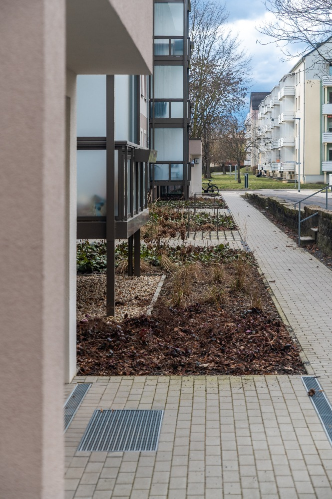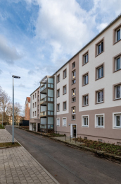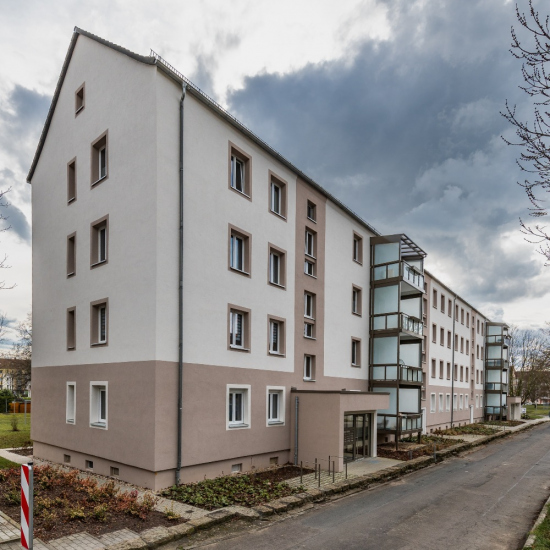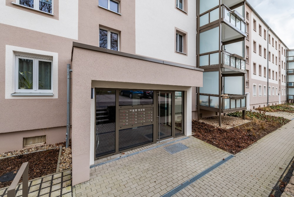 Ein zentraler Bestandteil der Maßnahme war die Zusammenlegung und Reduzierung der Hauseingänge von vier auf zwei. So konnten die Voraussetzungen für zeitgemäße Grundrissänderungen geschaffen und neue 2- bis 4-Raumwohnungen realisiert werden. Mit dem Anbau von acht Balkontürmen wurde das Wohngebäude zugleich funktional ergänzt und in seiner Nutzung spürbar aufgewertet. Auch im Bereich der Erschließung wurde der Bestand weiterentwickelt. Zwei neue Vorhäuser und der Einbau moderner Aufzugsanlagen verbessern den Zugang zum Gebäude und erhöhen den Komfort auf allen Etagen. Ergänzend dazu wurden auf der gegenüberliegenden Straßenseite 23 Stellplätze hergestellt.