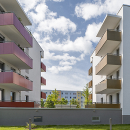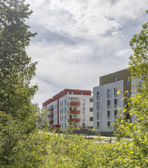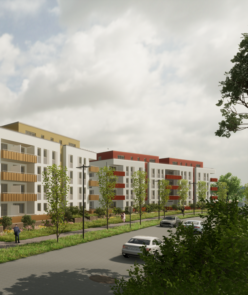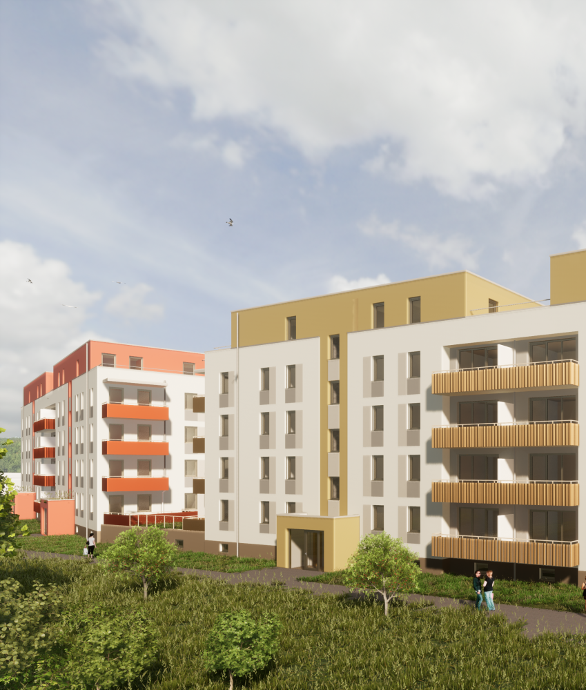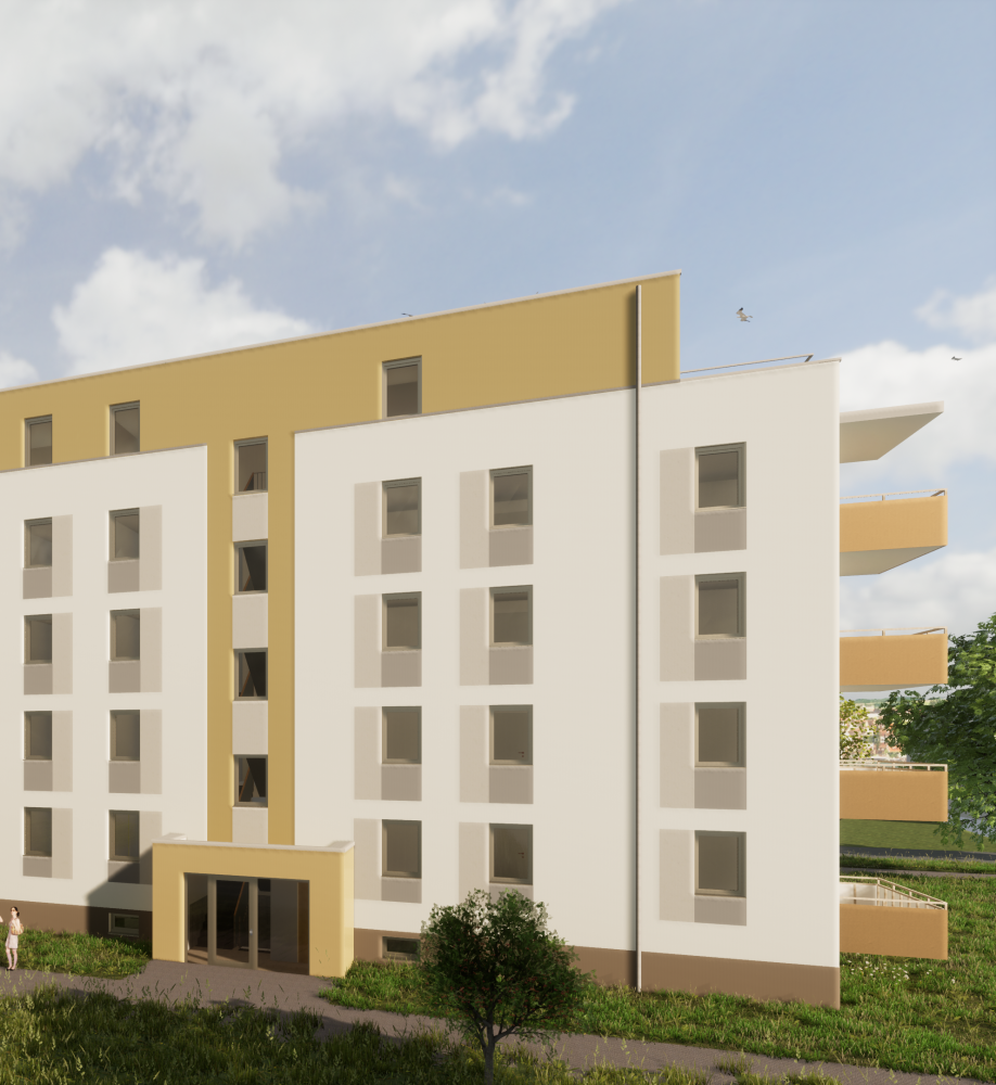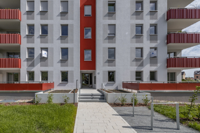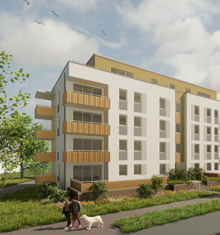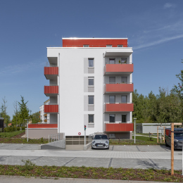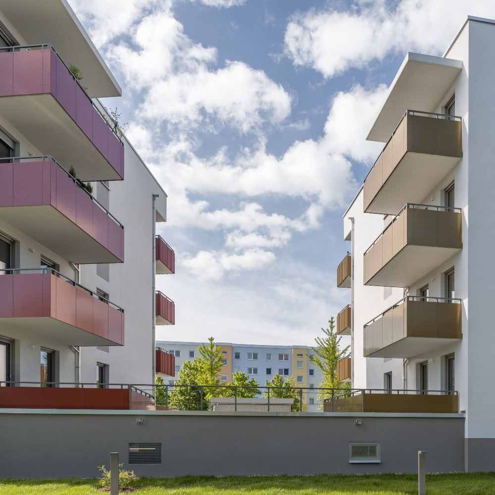 Auf dem Flurstück, welches über die Neratovicer Straße zu erreichen ist, wurden zwei Mehrfamilienhäuser mit insgesamt vier Hauseingängen mit je 10 Wohneinheiten errichtet. Acht giebelseitige Wohnungen wurden in diesem Zusammenhang barrierefrei ausgeführt. Neben den vier oberirdischen Vollgeschossen verfügen die Gebäude über jeweils ein zusätzliches Staffelgeschoss.