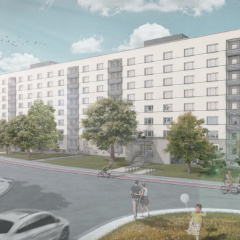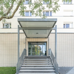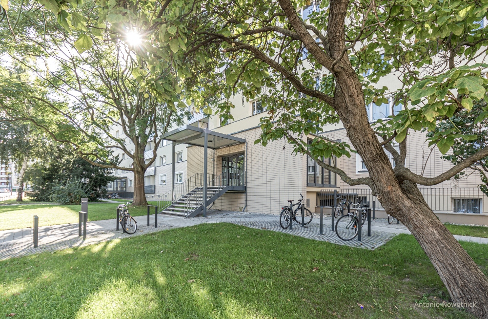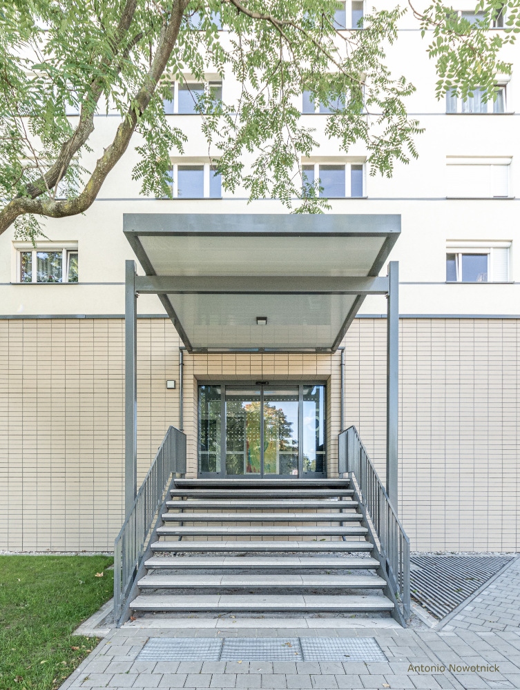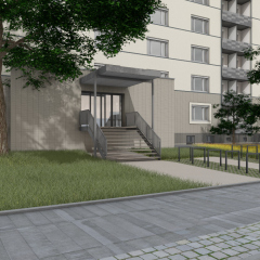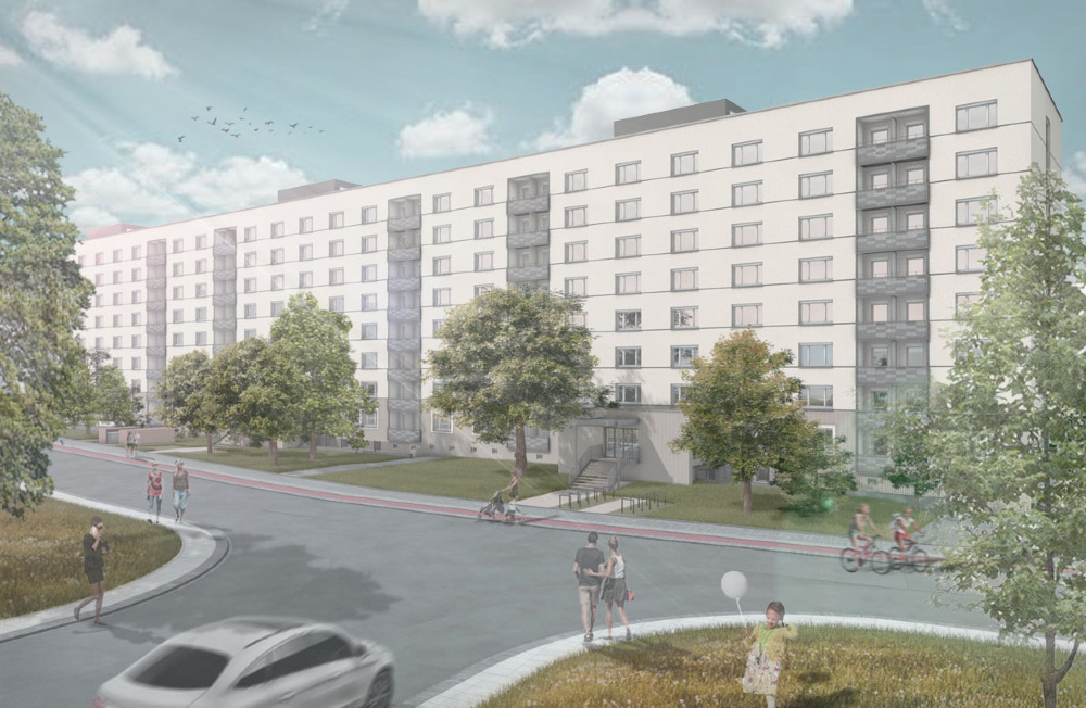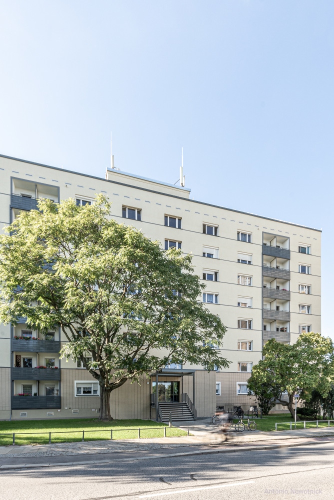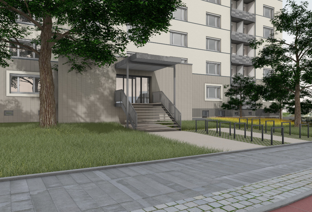 Die vorhandene Fassade wird überdämmt, im EG mit Klinkerriemchen bekleidet und vom 1.OG bis 7.OG verputzt. Die Dachabdichtung wird erneuert und es werden Instandhaltungsmaßnahmen am Dach ausgeführt. Die bestehenden Loggienbrüstungen werden demontiert und durch seitlich in den Loggienwänden befestigte Brüstungen auf einer Metallunterkonstruktion ersetzt. Der Hauseingang wird zentral in der die Vorhäuser abschließenden Wandscheibe angeordnet und um eine neue, überdachte Treppe ergänzt. Die seitlich an den Vorhäusern befindliche Bestandstreppe wird entfernt, während die bestehende Pfosten- /Riegelkonstruktion inklusive Eingangstür durch eine neue ersetzt wird. Zusätzlich werden die Außenanlagen vor den Eingangsbereichen umgestaltet.