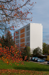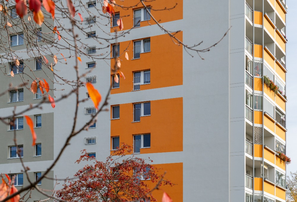 Zusätzlich zur technischen Sanierung wurde auch das Design der Fassade durch unsere Architekten überarbeitet und das Gebäude mit einer modernen Farbgestaltung wirkt nun frisch und modern.